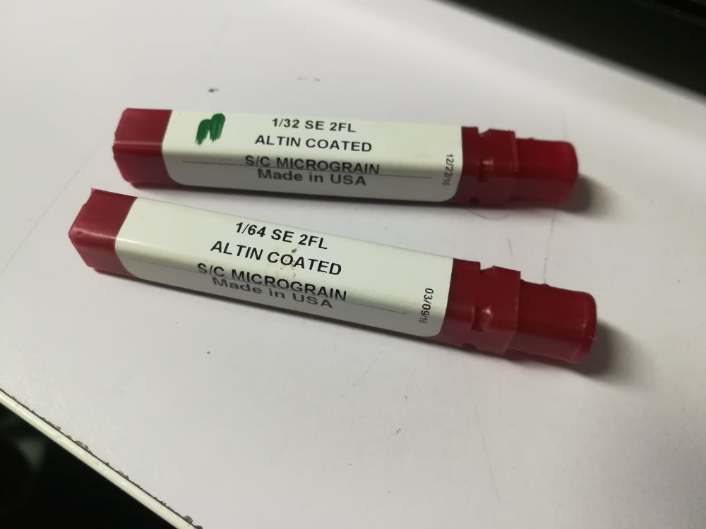 Now, we need to prepare the endmills. We use two types of endmills. A 1/64 endmill to mill the traces and a 1/32 endmill to mill the outline of the board.