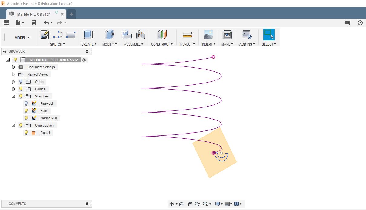 Then, I created a new plane at the lowest point of the coil, where I sketched a half ring shape.