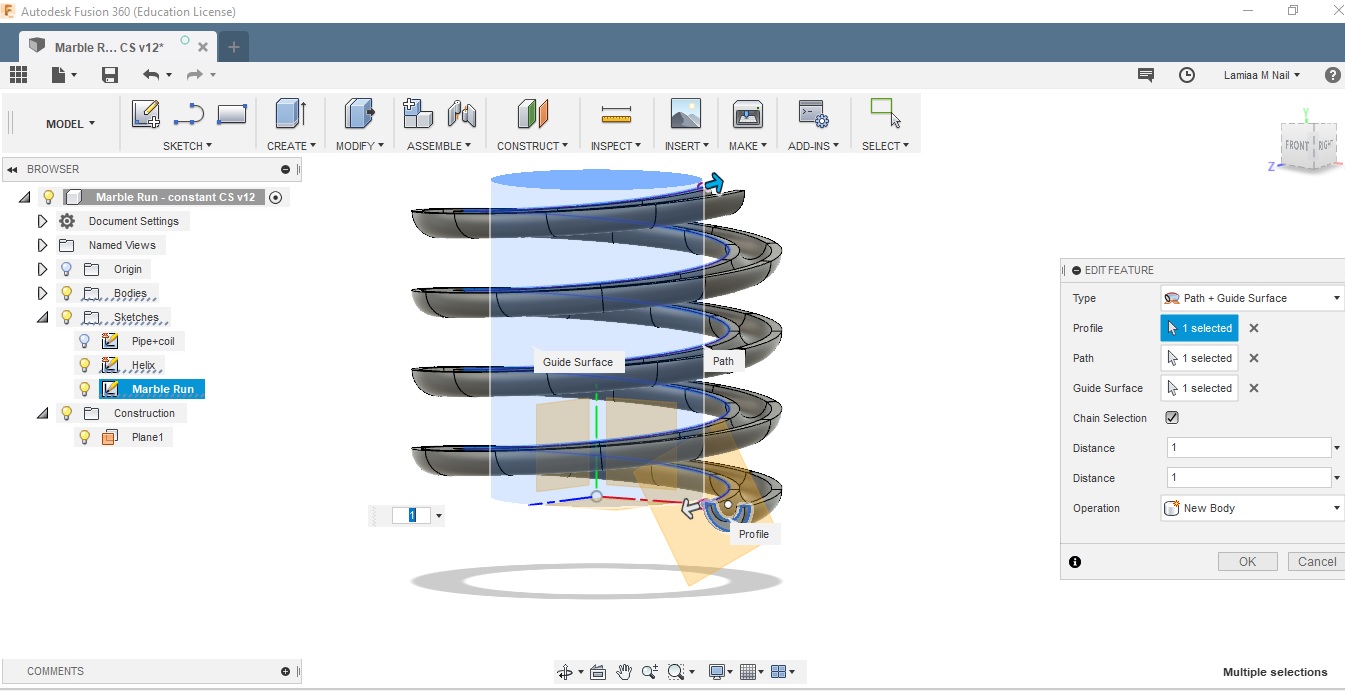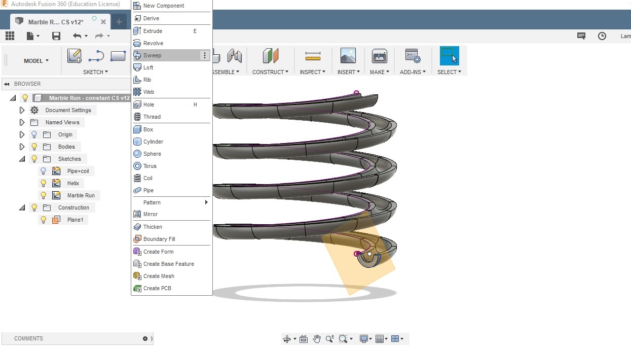 Then, I used the sweep tool to create the track. I chose the helix as the path, the half ring as the profile, and the cylinder that I've created earlier as the guiding surface.