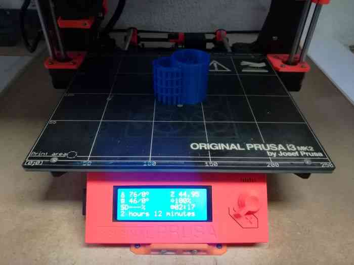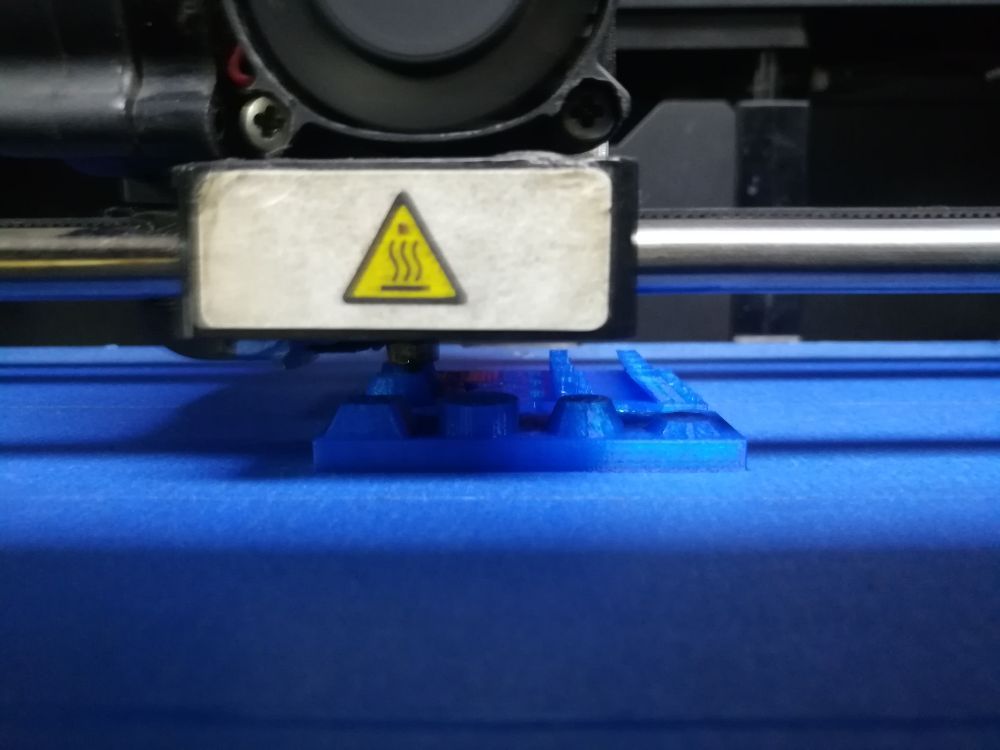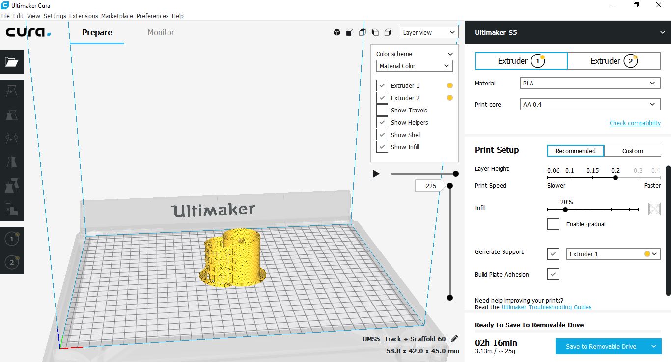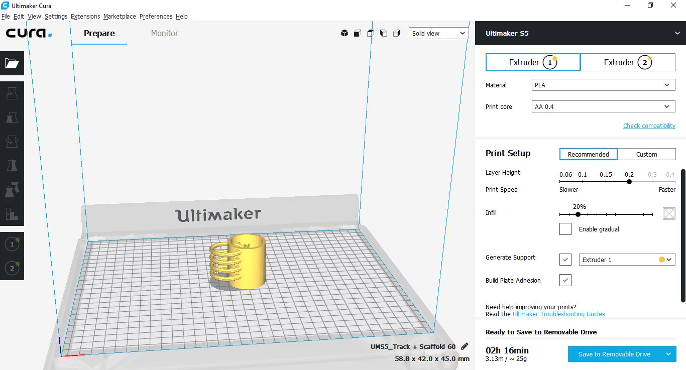 I used the Ultimaker software to set the printing parameters and slice the object. I used a 20% infill and 0.2 mm layer height. And I used supports between the rings of the track.