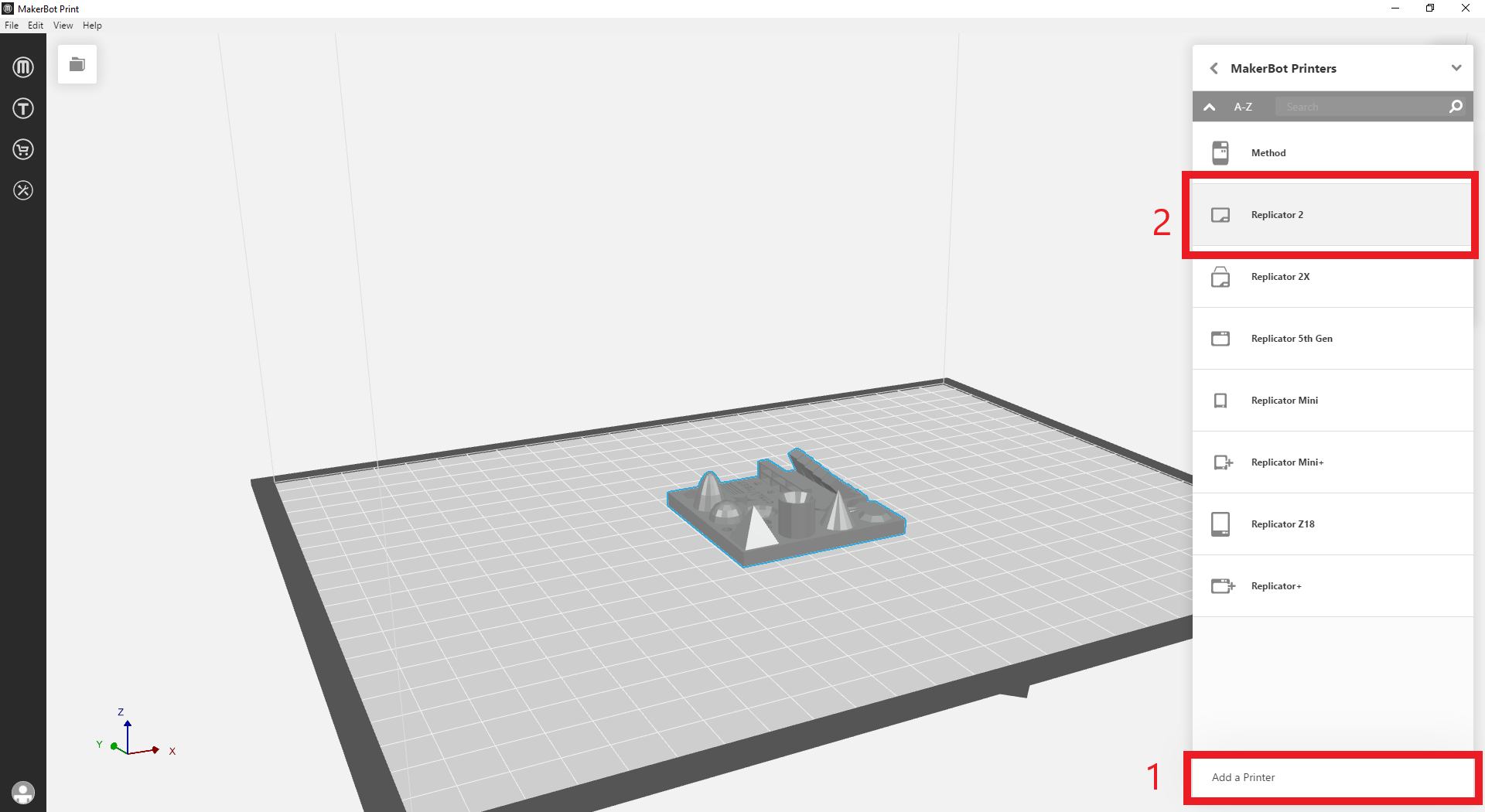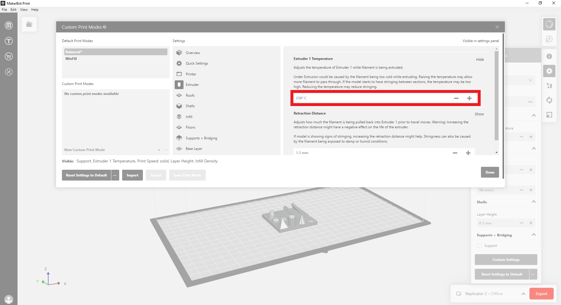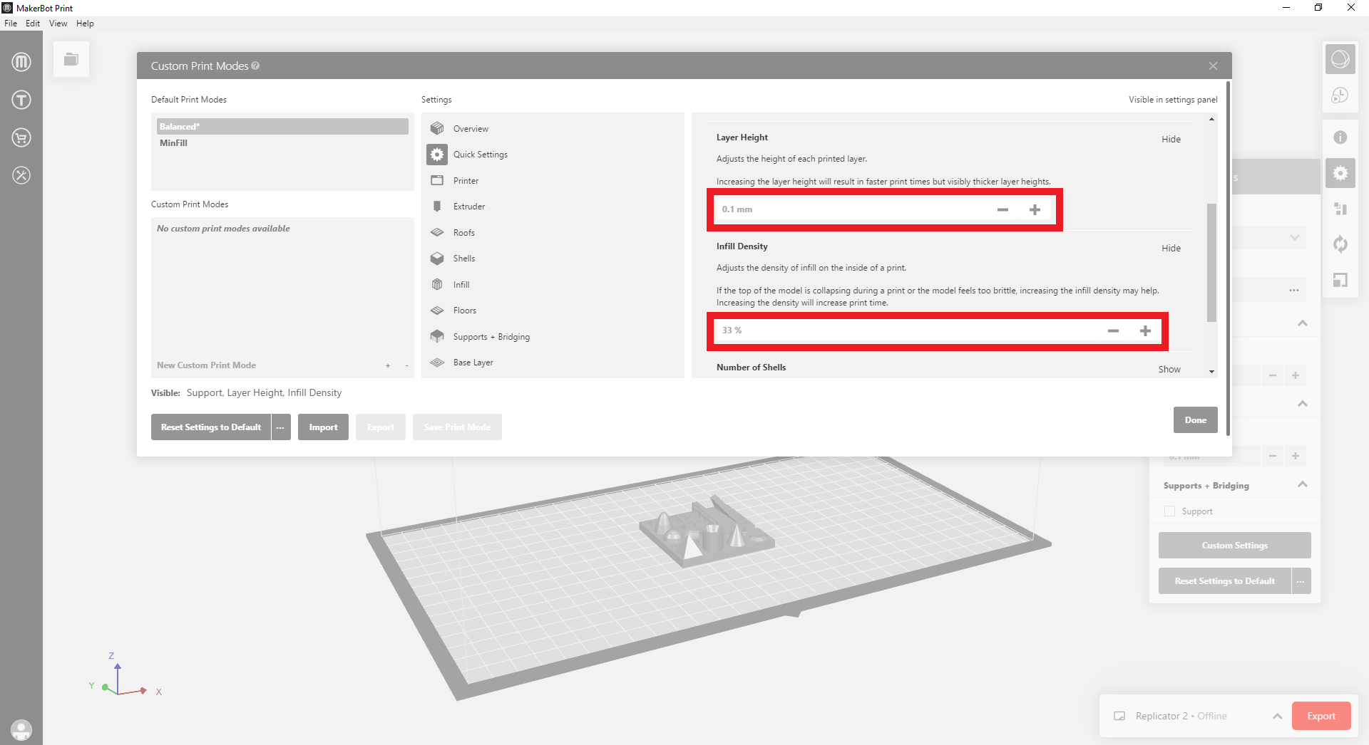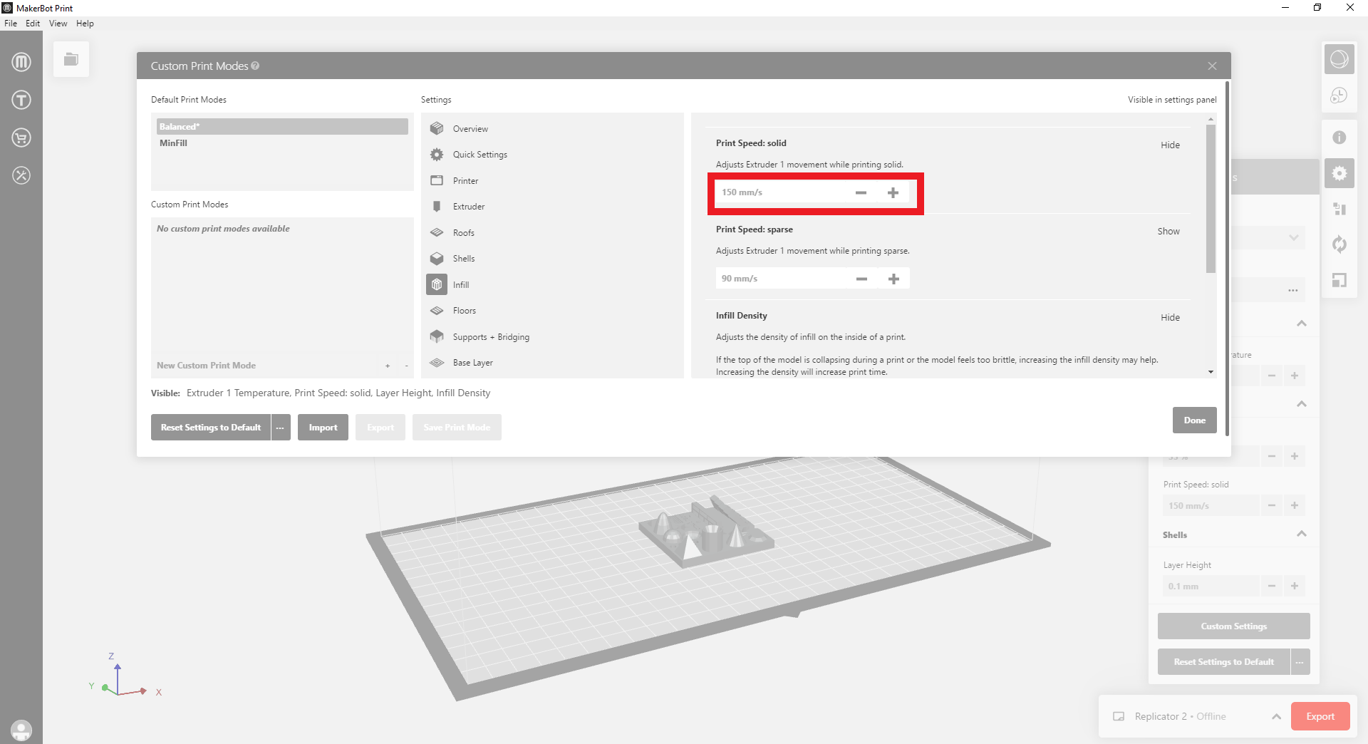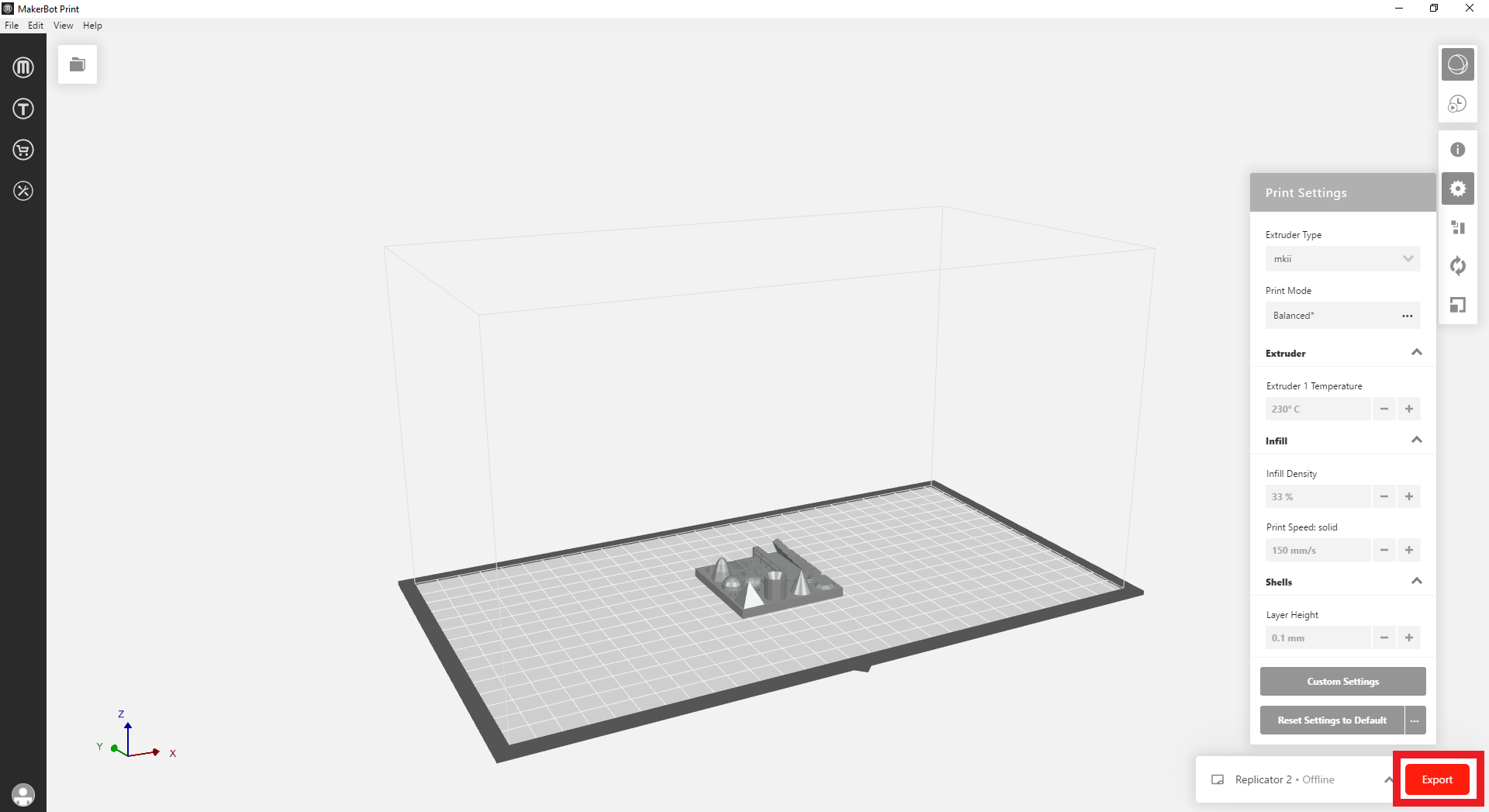 I imported the test part in Makerbot software to set the printing parameters. The designer recommended the following printing parameters: 33% infil , 0.1 mm layer height, and printing speed between 60 to 200 mm/s.
