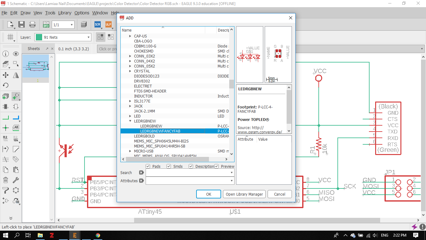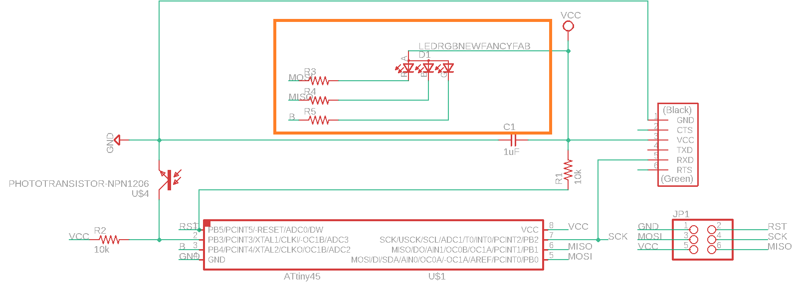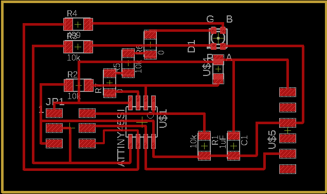 I designed the board on Eagle by following the RGB LED board design on Fab Academy's website, added the RGB LED component to the phototransistor board from last week.