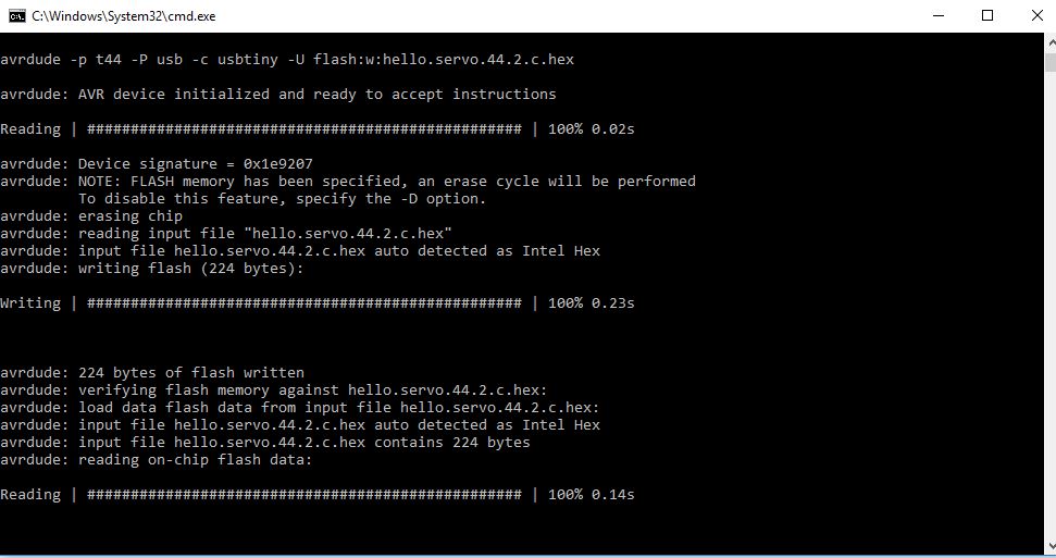 I used the make program command to upload the c code to the board using FabISB: make -f hello.servo.44.2.make program-usbtiny