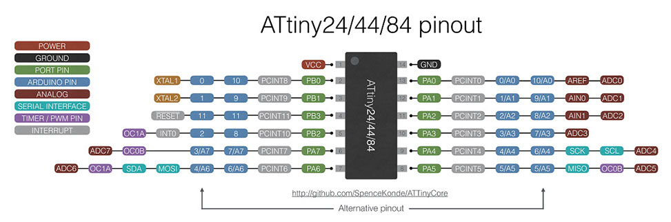 Using the pinout diagram of ATTiny 45, I mapped the 3 pins PB0, PB1 and PB4 in the ATTiny 45 to 0, A2 and 1 respectively in the Arduino.