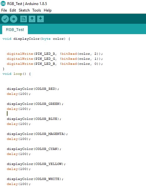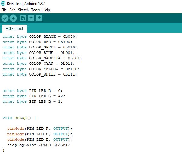 I programmed the RBG LED to light up with 8 colors: Red, Green, Blue, Magenta, Cyan, yellow, White and Black. Each color is a combination of 1, 2 or 3 colors as will be shown in the code below.