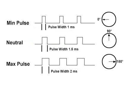 The pulse that a servo take determine the position of its shaft. The minimum pulse (1 ms) rotates the shaft to the 0 degrees position, the neutral pulse (1.5 ms) rotates to the 90 degrees position, and the maximum pulse rotates to the 180 degrees position.