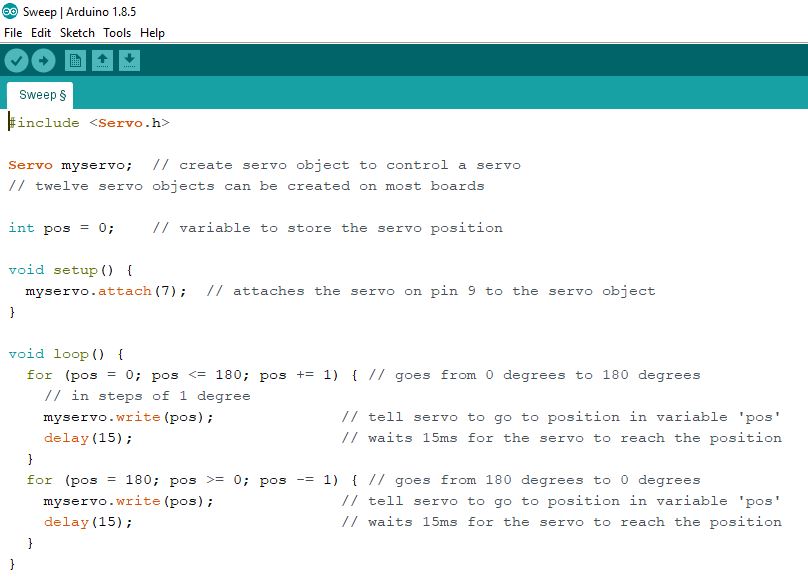 Then, with the help of our instructor, our first attemp was using Arduino IDE to program the board. Arduino IDE provides a whole servo library. I used the sweep example on the Arduino IDE, I just changed the output to pin 7 where the servo is attached to the Attiny 44. However, it didn't work.