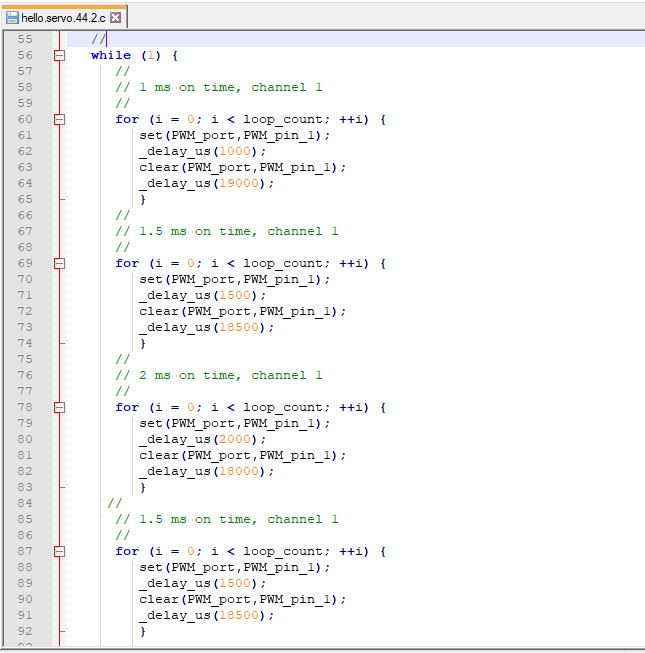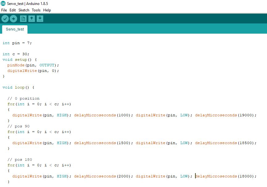 Our third attempt was actually trying out Neil's code for software PWM. I made minor edits to the code, I kept only the code parts to control one servo motor.