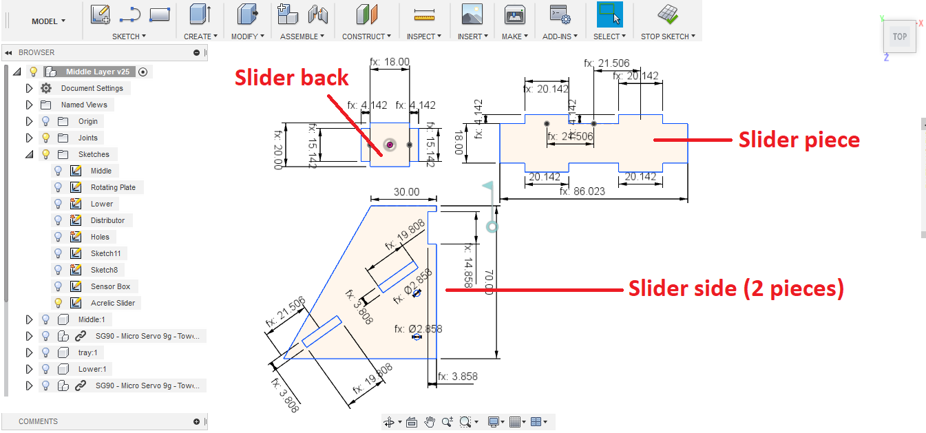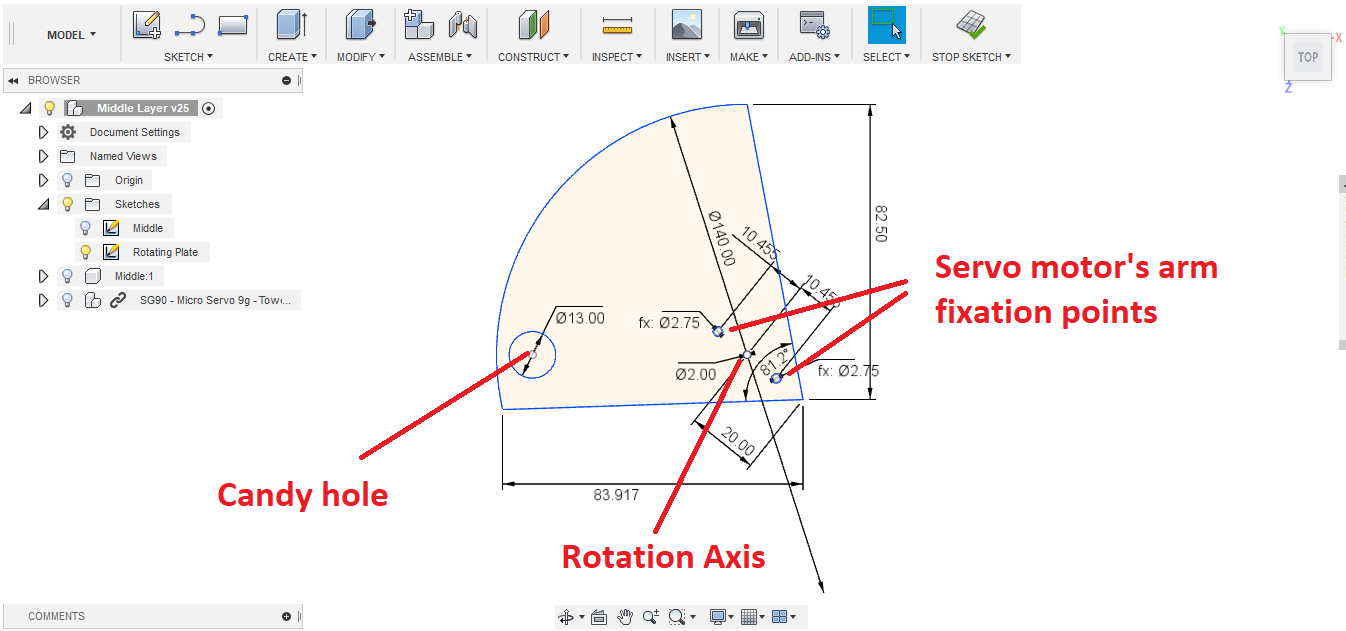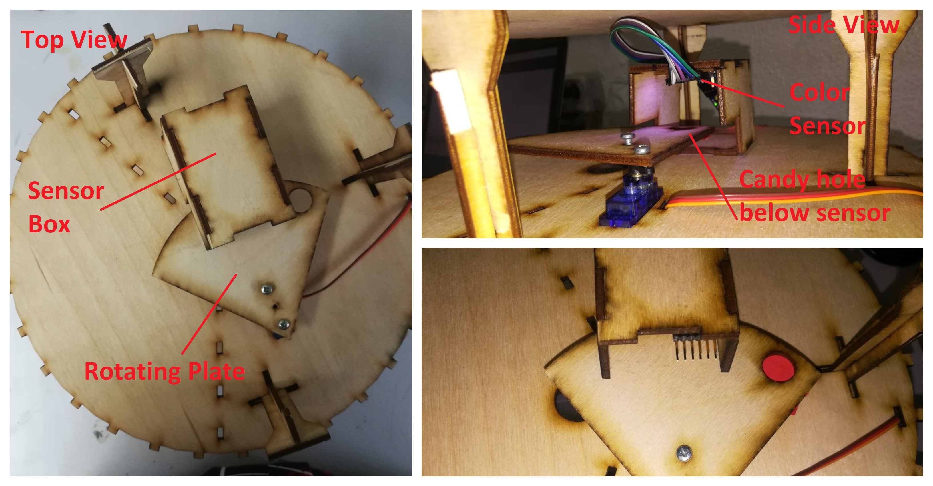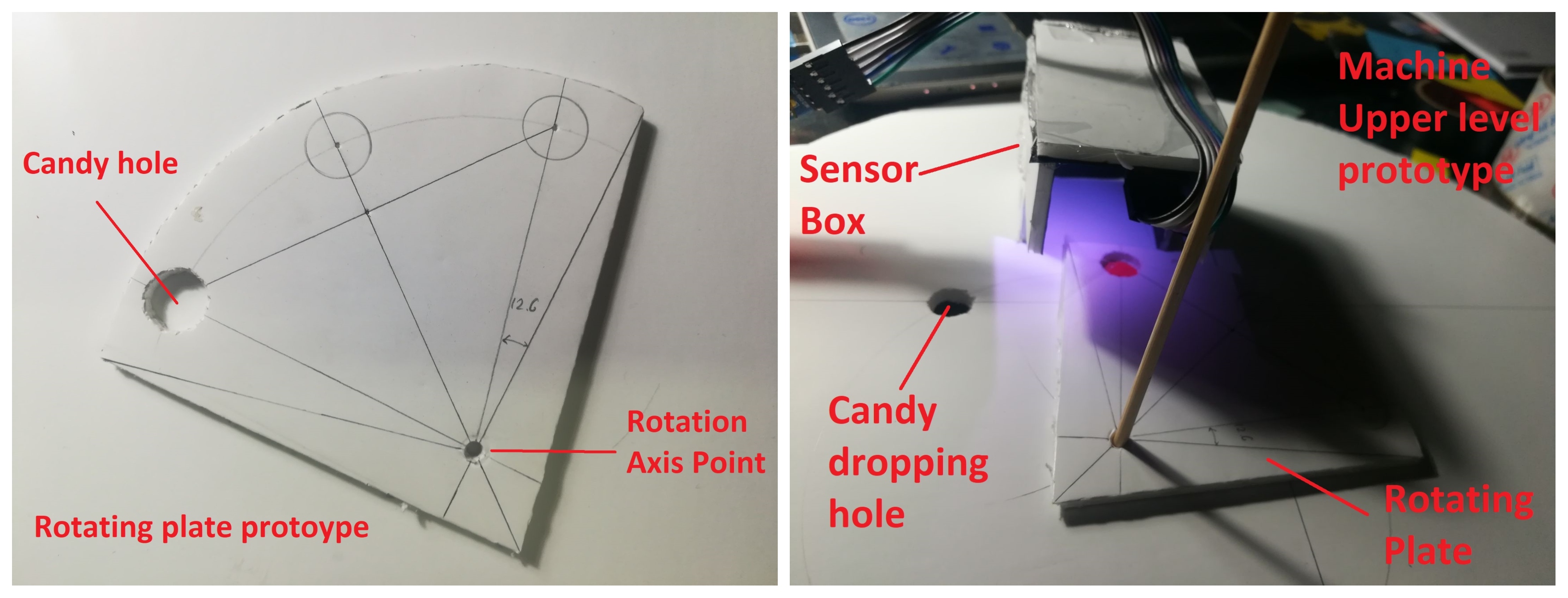 We calibrated the angles of the upper servo motor as follows: an angle of 0 degrees as the intial position of the rotation plate, 75 degrees as the sensor position, and 105 degrees is the dropping hole position.