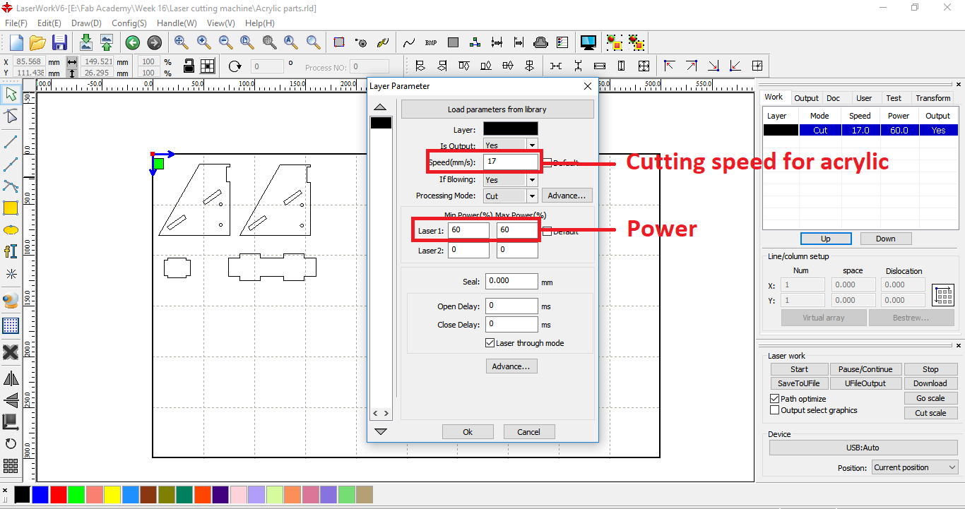 Imported the DXF files into LaserWorksV6, set the power to 60 and speed to 17.