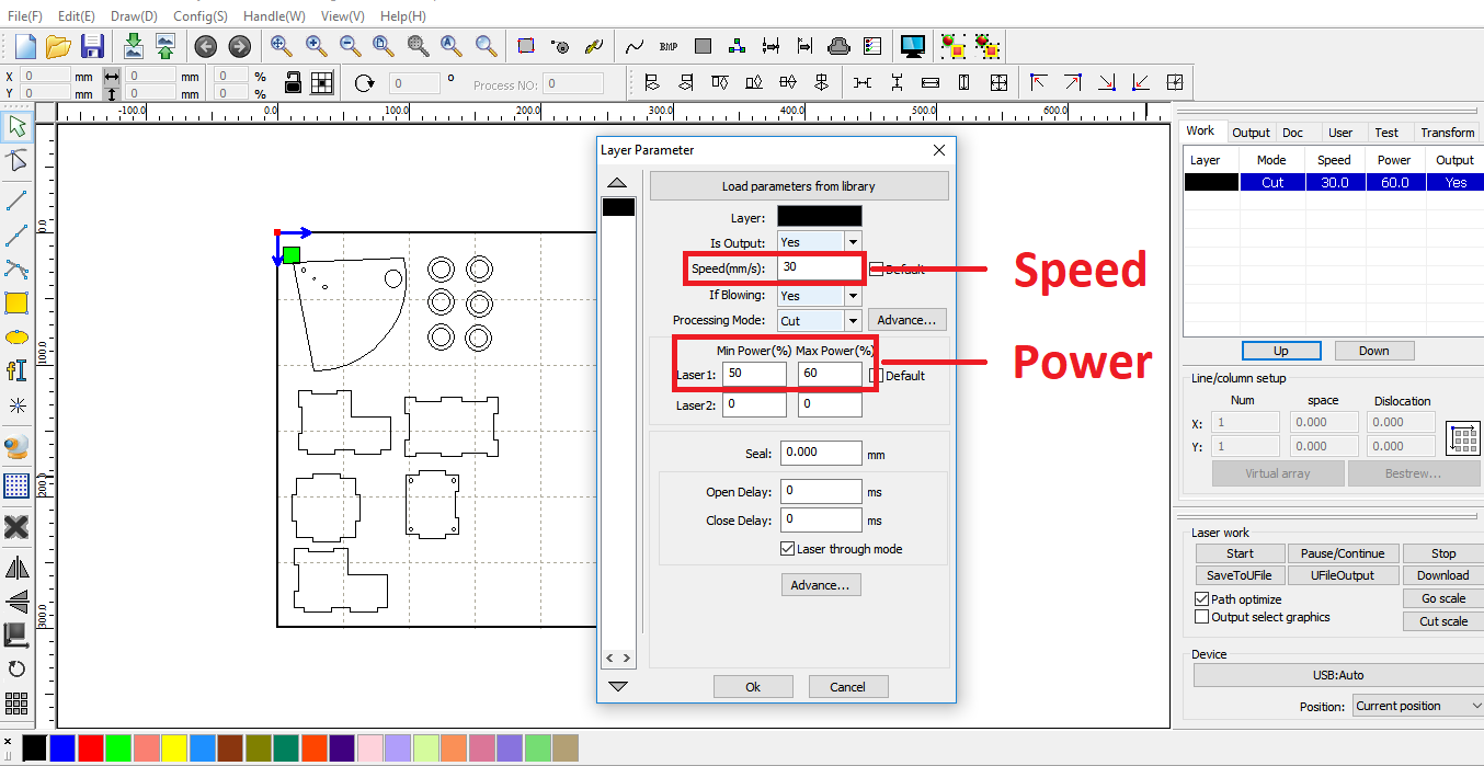 Imported the DXF files into LaserWorksV6, set the power to 60 and speed to 30.