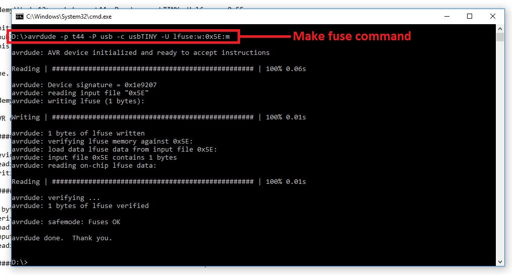 I soldered the servo board, connected it to the FabISB programmer and started with making fuse, to command the attiny44 to use the external crystal.
