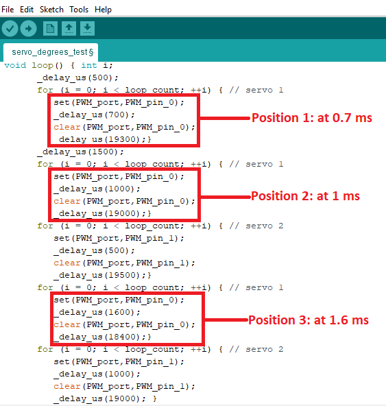 To figure out these angles, it wasn't a straight forward task I had to change the PWM and notice where the servo will angle will end up. This is because the FiTec FS90MG microservo motor's angle range is 120 degrees not 180 degrees, so the straight forward mapping of the PWM: 1ms to 0 degrees, 1.5ms to 90 degrees and 2ms to 180 degrees was not possible.