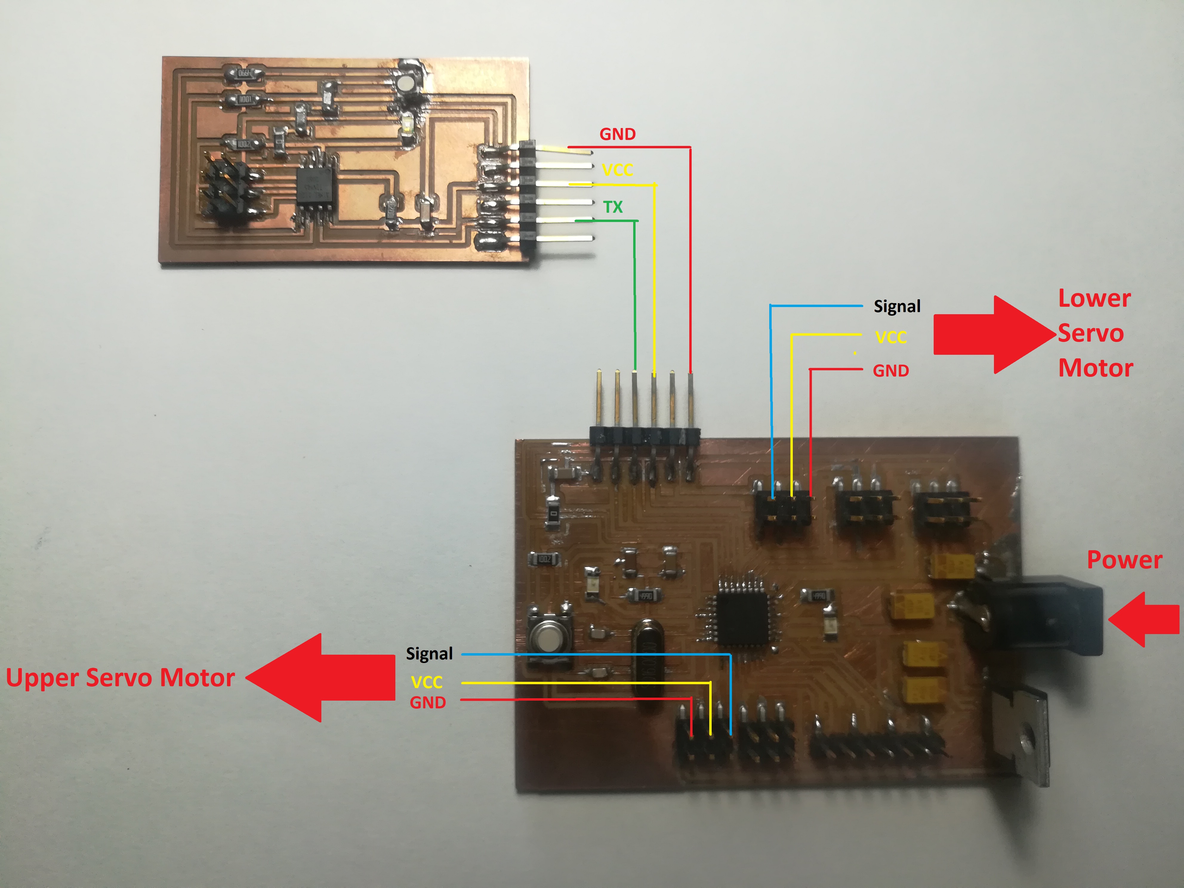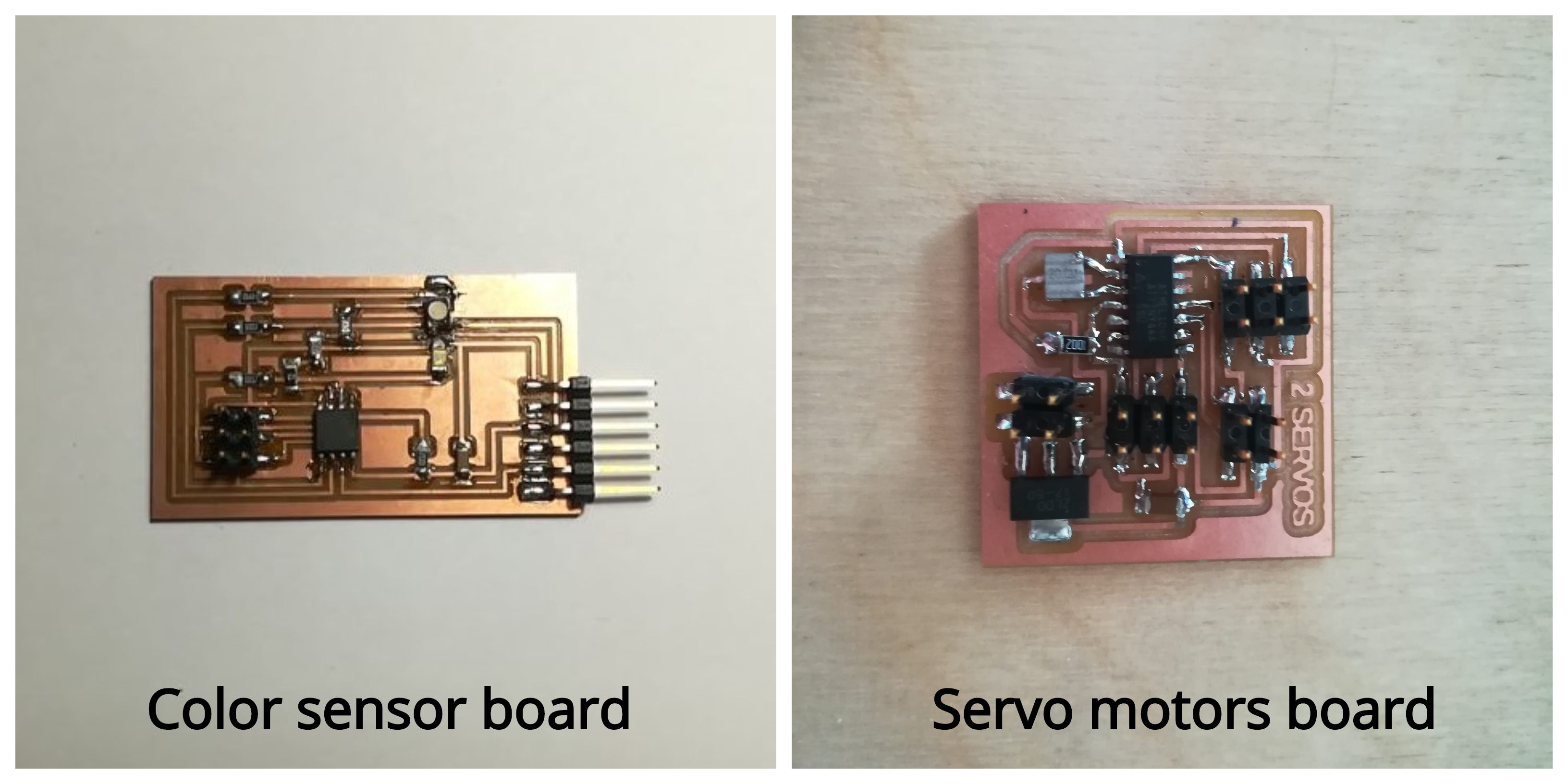 Microcontroller boards: I worked with the servo motors board that was designed and fabricated by Nada . While we used the color sensor board that I designed and fabricated in the the input devices week.