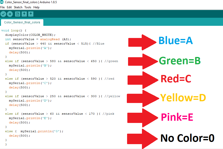 sensorValue is then sent via serial communication to the serial monitor. This value changes based on color as I mentioned, so we simply write down these values by hand to use it later in the code that will control the mechanism.