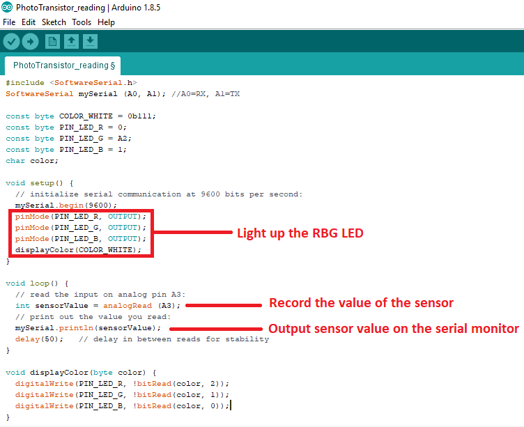 This wavelength is recorded by the phototransistor on the board, turning it into an analog electrical signal which is then recorded in a variable named "sensorValue".