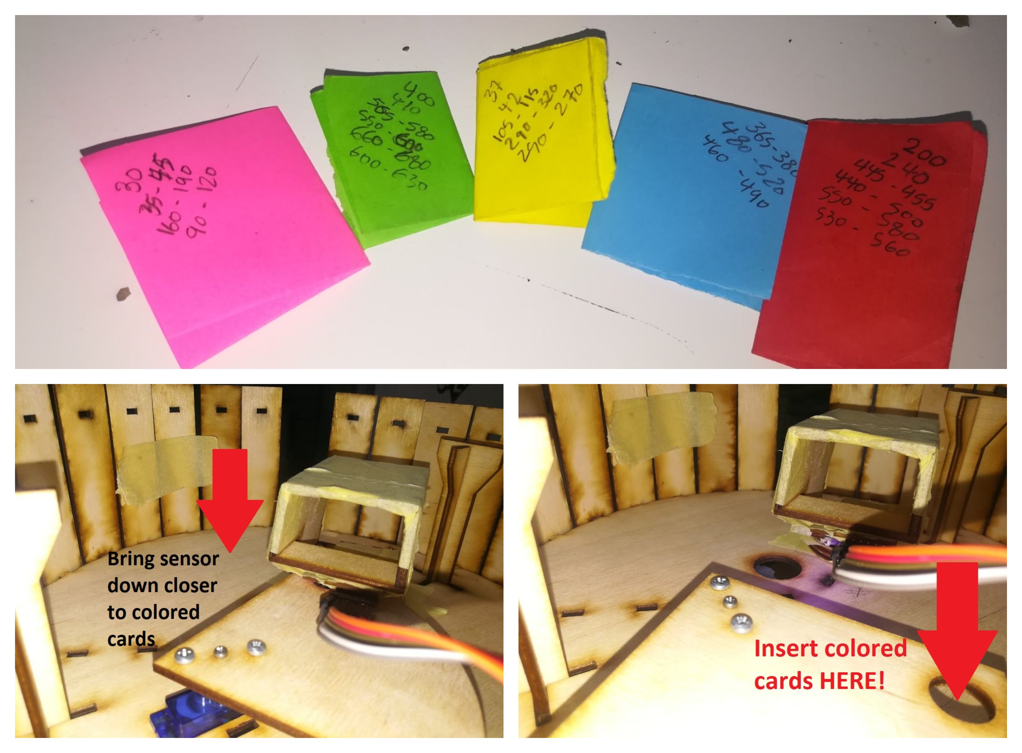 For the lower servo motor, each color/character was assigned a unique position/angle. Blue at 0, green at 25, red at 50 and yellow at 75.