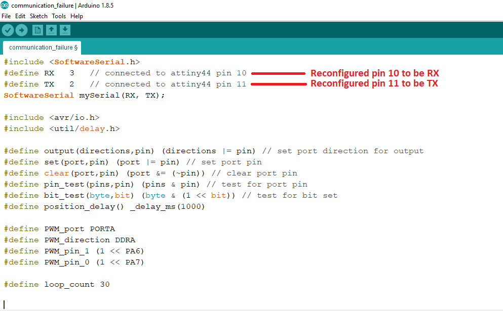 The problem here was unclear, but we had a couple hypotheses in mind. First, the problem could be that we were sending a character '700' rather than a character "A", which didn't translate well through serial communication, and the condition was always false. There was another hypothesis, that serial software library doesn't work well with attiny44 leading to communication failure.