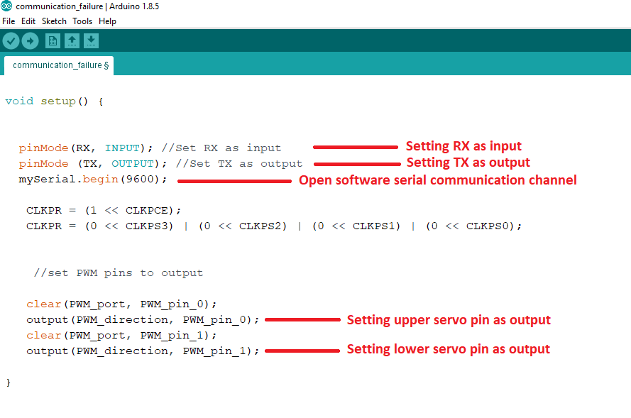 Then, open the software serial channel, and set the RX pin mode to receive (input), while TX pin mode to transmit (output)
