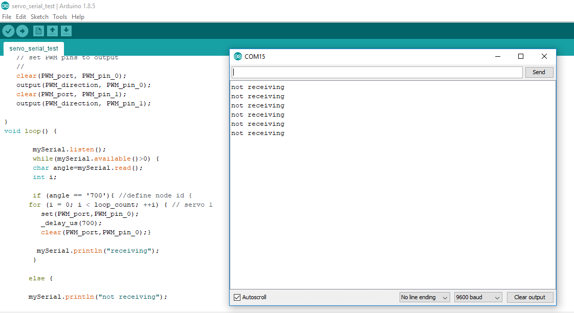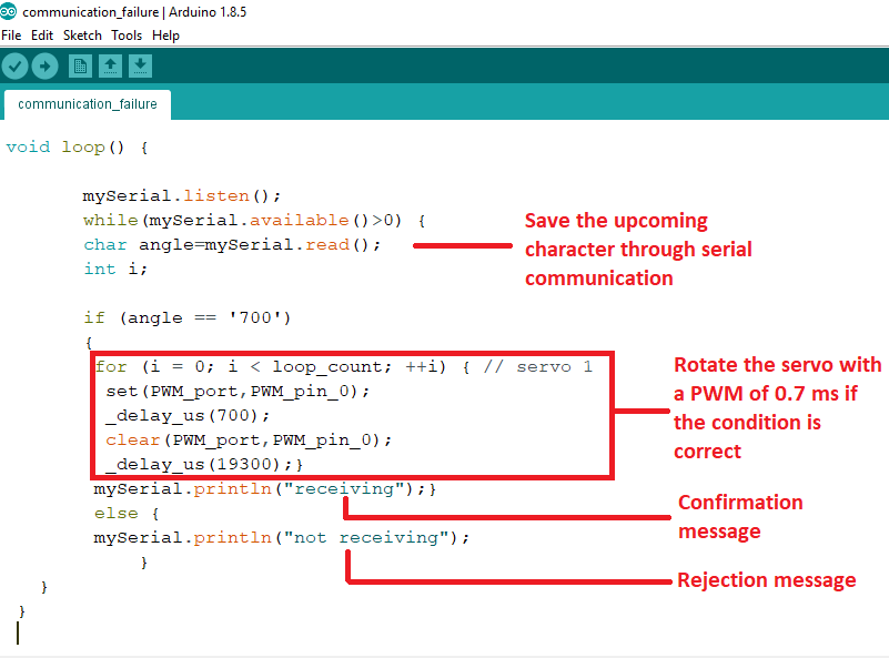 Once the communication is open, the servo board receives the character that has been entered and compare it to the one in the if condition, when true the servo motor is set to rotate at 0.5 ms and a "received" confirmation message is sent to the serial monitor. When false, a rejection message "not received" is sent to the serial monitor.
