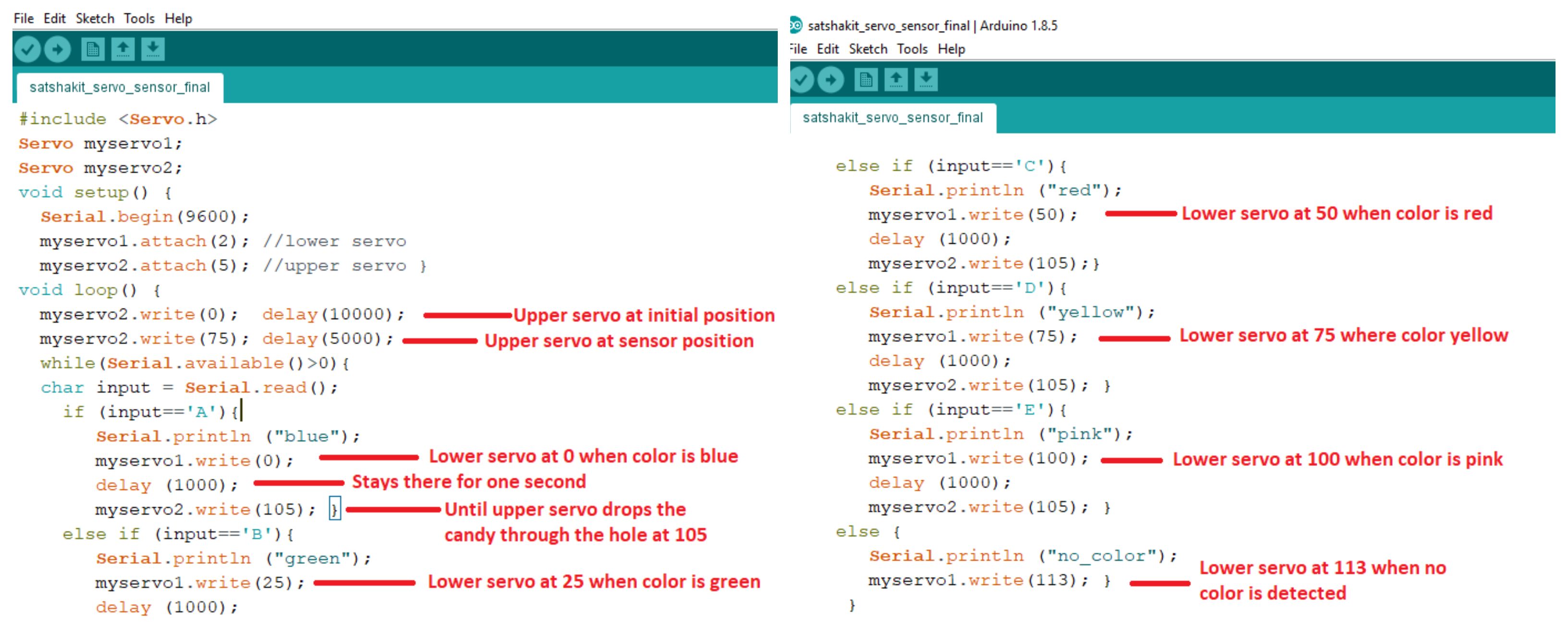 The final angles of the desired position for servo motor at the upper level of the machine were: 0.7 ms for the intial position were the candy is collected, 1ms for the second position at the sensor box, and finally 1.6 ms for the final position at the hole through which the candy will be dropped to the lower level.