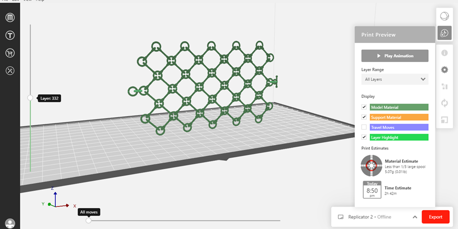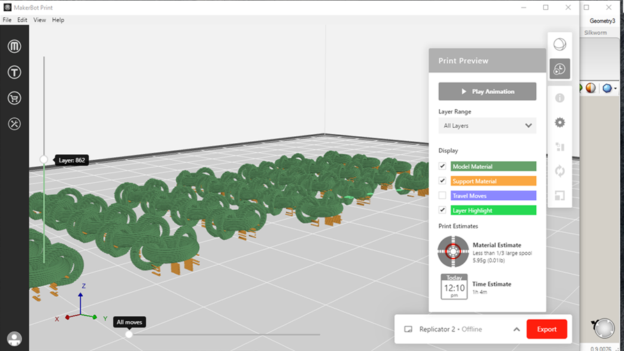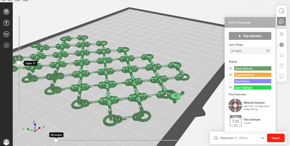 Estimate the grames and the time… but I noticed that MakerBot doesn’t see the members in my part and doesn’t estimate the whole shape. So Haggag recommended to export my design to MeshMixer then export it to MakerBot. But I got the same result!