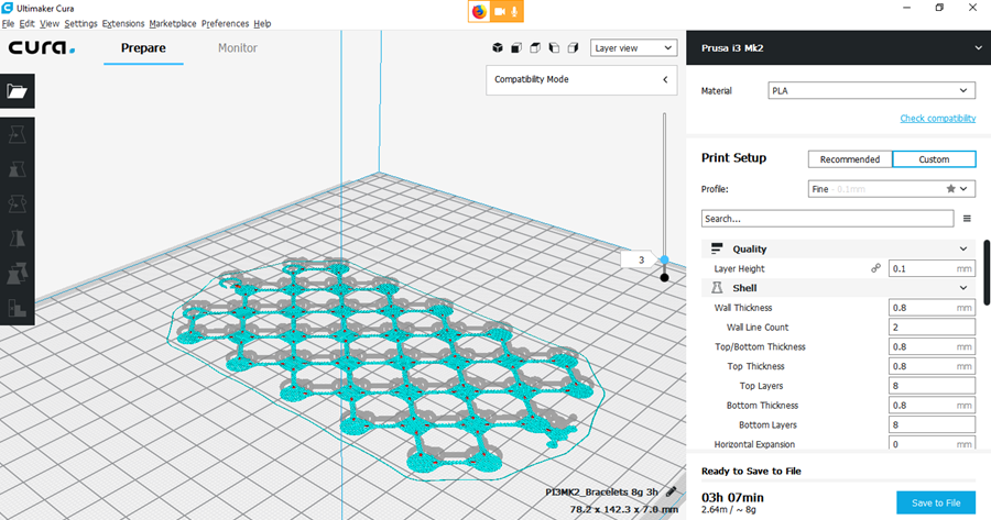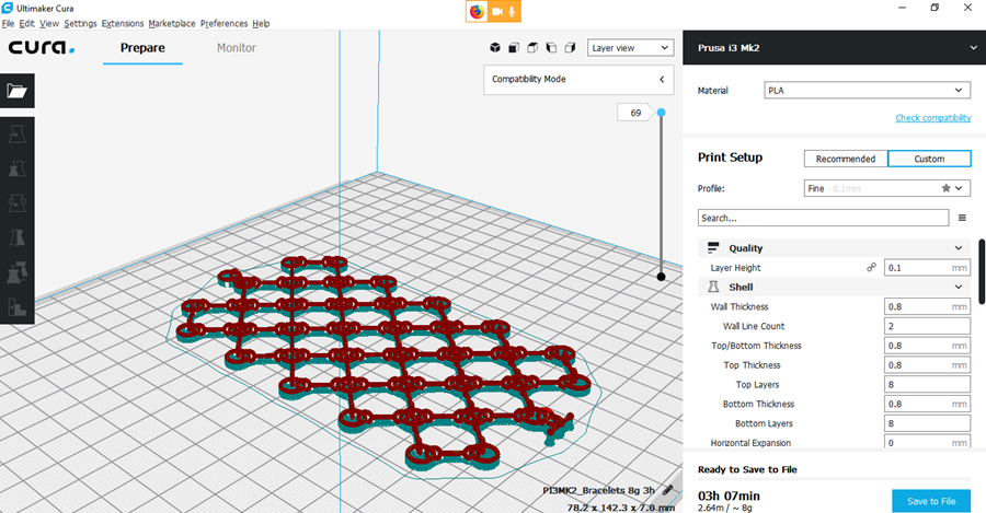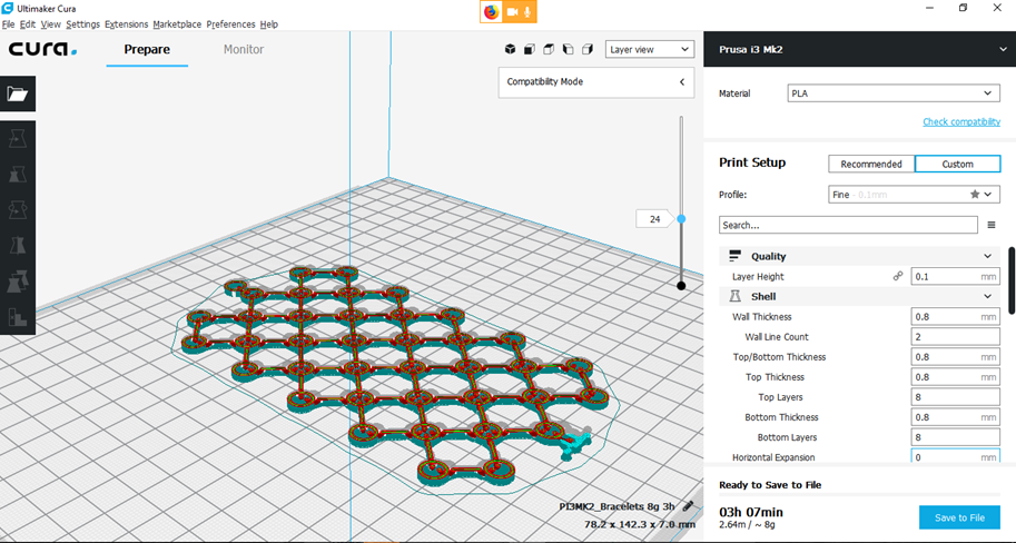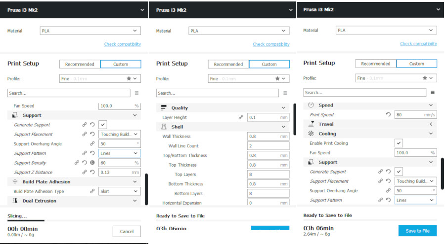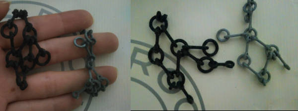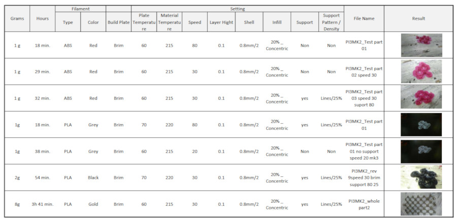 I started with 3d printers, two of them Prusa MK3 and Prusa MK2. Used just one Gram of my part with about 8 members and 6 rings, to test the best setting for this part.