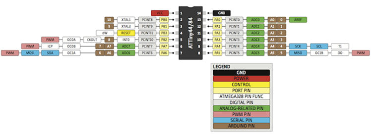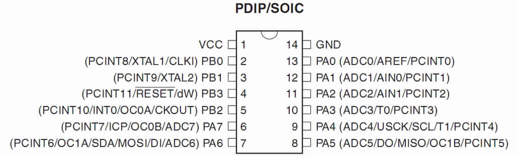 So I back to Neil’s board… I found myself will redraw the PCB from the first if I used the same PINs, plus all pins of attiny44 from 8 to 14 can use. So I searched quickly about attiny44 to see its PINs from this photo