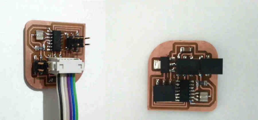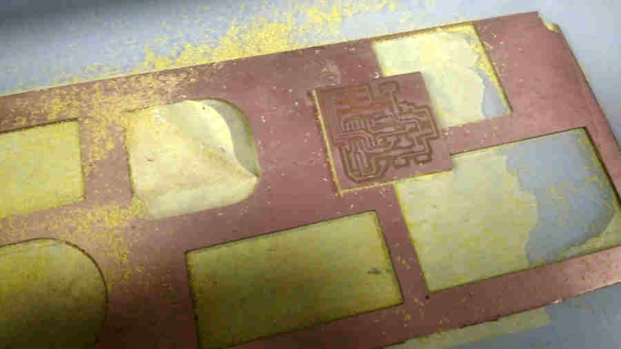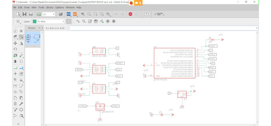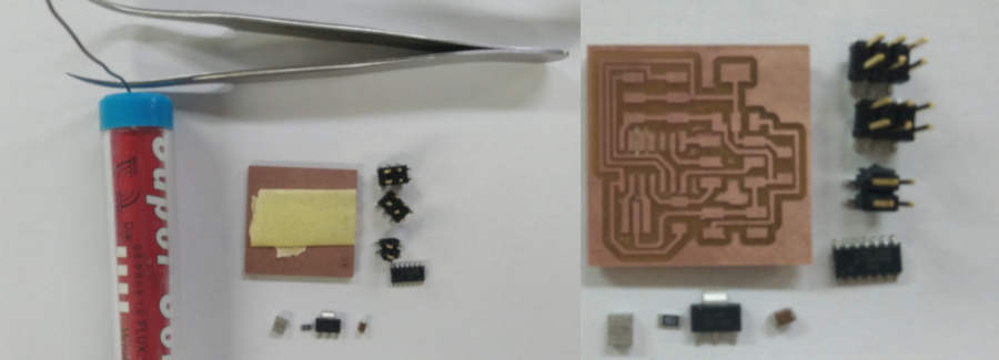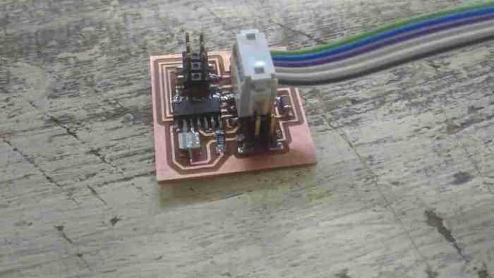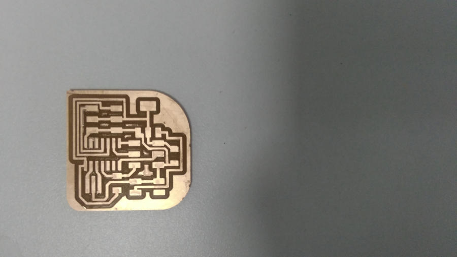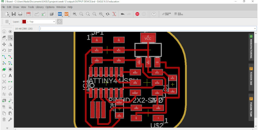 I changed the plate of the machine with the plate we made from the previous weeks, and follow the steps of production PCB. I had a problem from the last week with the milling and Lamia also had this problem and we didn’t know why. The issue is, after set up the x,y,z position and the machine start milling, it just drew didn’t mill the copper! So we forced to increase the cut depth. I remembered I reached to 0.18 and Lamia reached to 0.25!