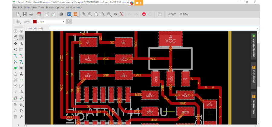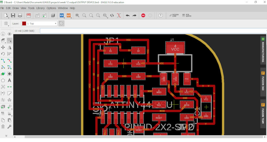 So I made the same schematic as Neil’s board but I have a problem to make the same traces from another board … So I connect my own traces … and that made me to change the servo pins. Neil used PINs ‘PA6 & PA7’ for Servo 0 and Servo 1. what made me not use the same PINs that I made this board in two stages … First the schematic and the second stage for the layout… So I forgot in the first stage to connect servo PINs with ATtiny 44! and imagined that I finished So Started in the layout directly. Then this is the result