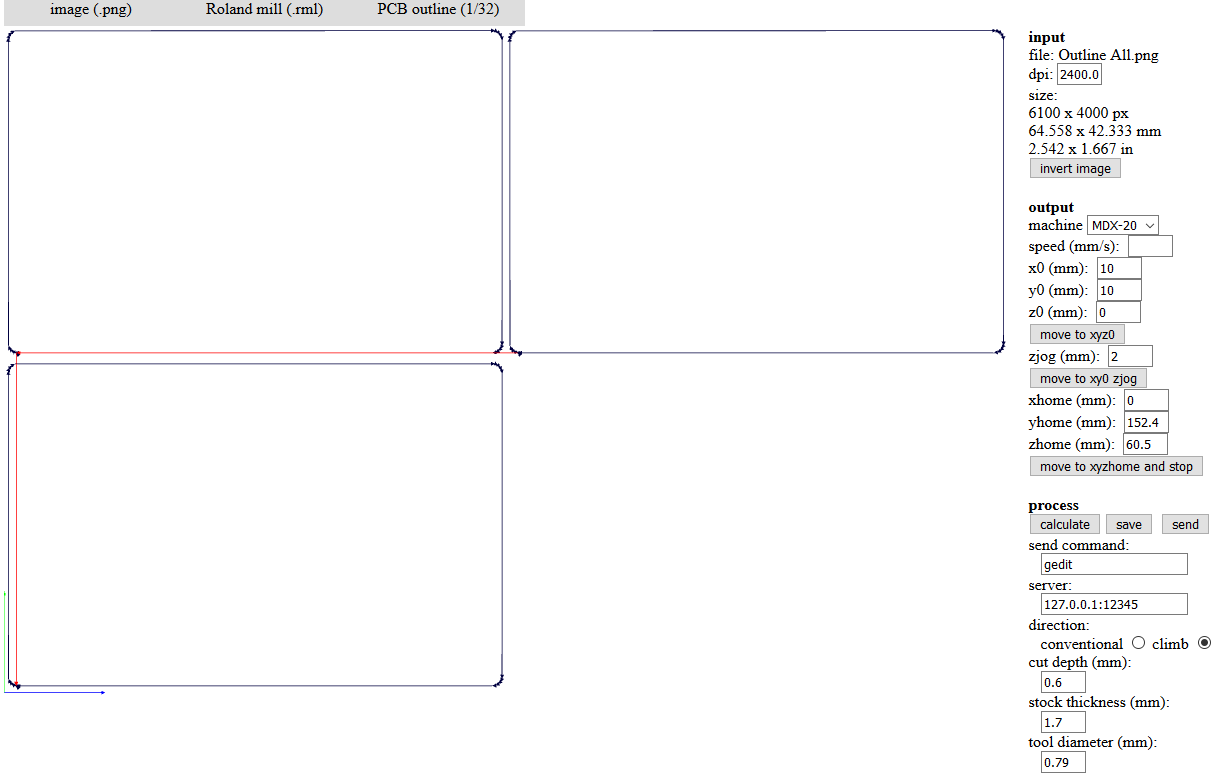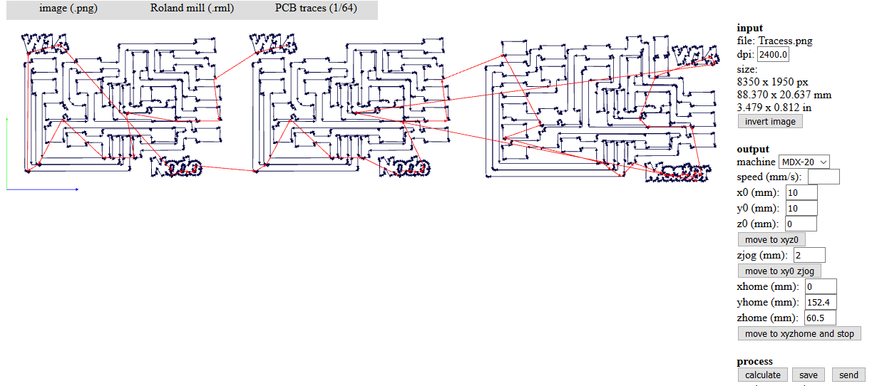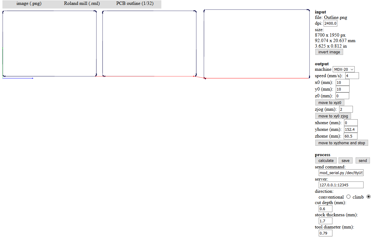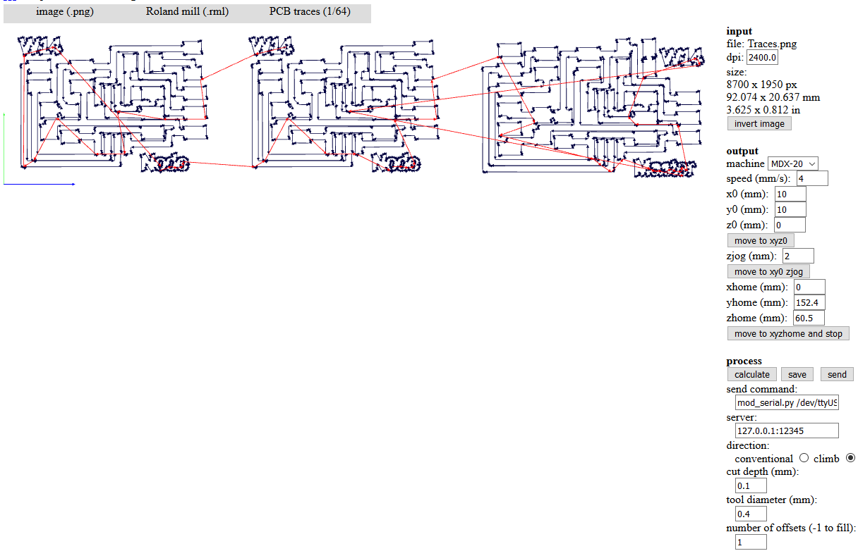 The fabrication Process takes 20 min.s for traces and 2 min.s for outline.