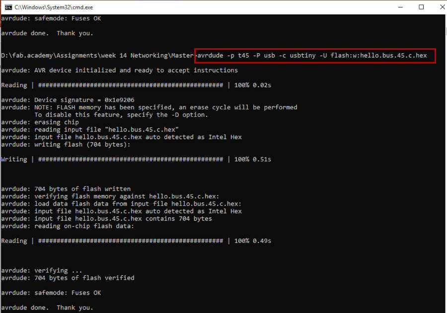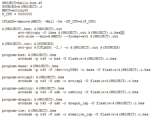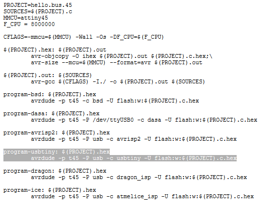 avrdude -p t45 -P usb -c usbtiny -U flash:w:hello.bus.45.c.hex