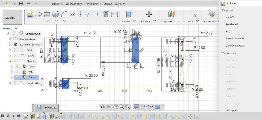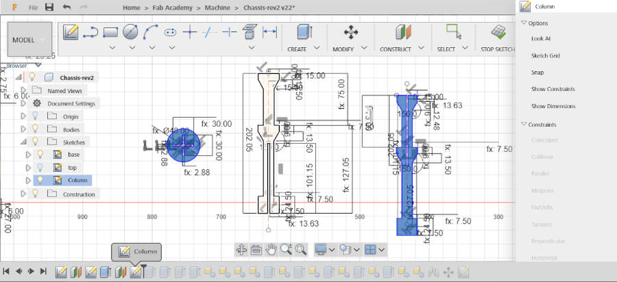 - After, I coordinate the heights between the layers with Lamia, because it will reflect in the 3d parts that she designed and the height of columns structure that I will design. I started to design the columns. I choose this shape to be easy cutting in laser cutter, we didn’t want to use 3d printing in this stage, we just make a prototype machine and test our design in this version also we have a limit time. Plus, we can design this column with 2D. So, I designed many columns, but this one I think it will be stable structure.