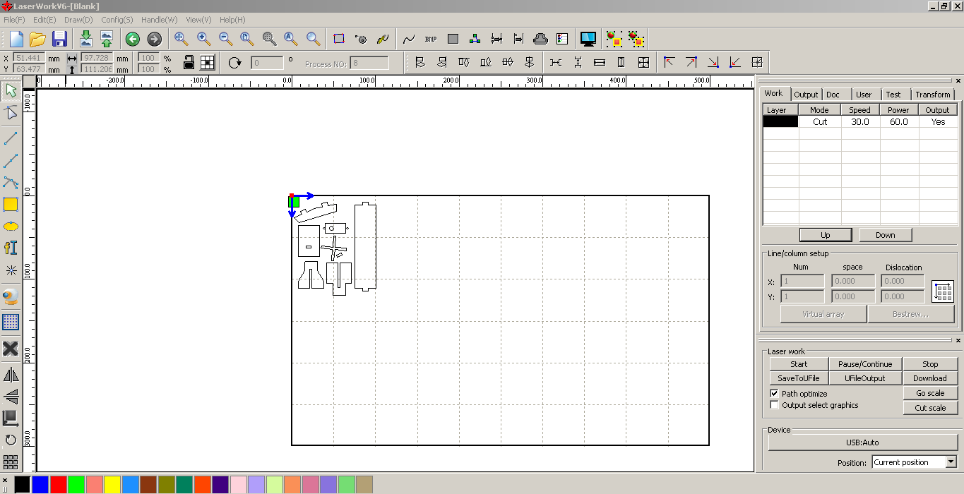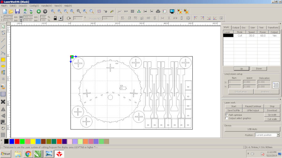 - After testing I found the power 60 and speed 30 with Kerf 0.25 is good. So I started to cut my sheets.