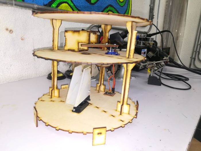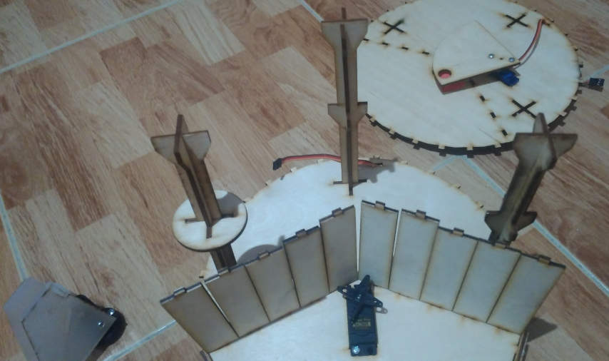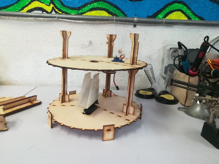 - I started with the plate … We need three circle layers in our machine … One of them to the base that the servo motor fixed in. The second layer in the middle of the machine. The third one is the top layer. Between the second and the third layer, there are a servo motor, the PCBs and the phototransistor box that Lamia will design.