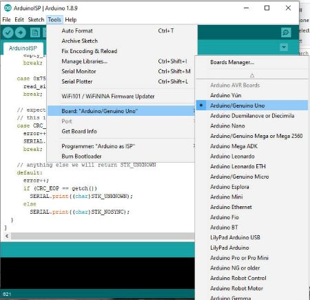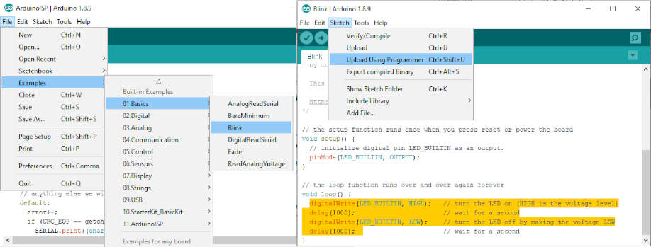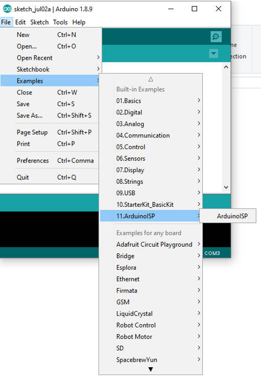 - File > Examples > ArduinoISP