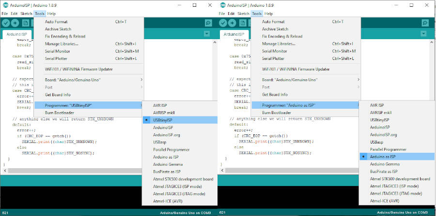 - Tools > Programmer > Arduino as ISP / USBtinyISP
