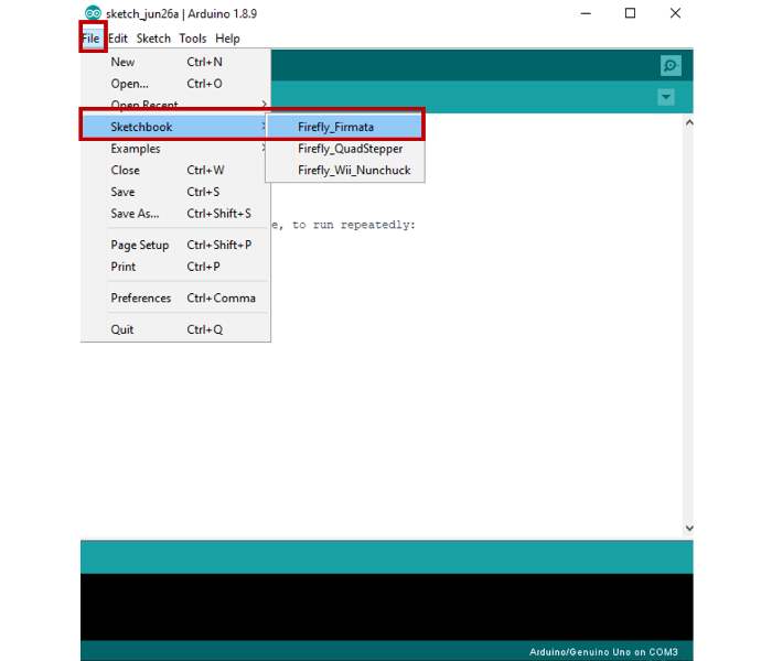 Open File >> Sketchbook >> Firefly_Firmata