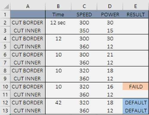 Then Kamel teaches me to test the material with laser cutting. We started with speed 300 and power 30 for cutting border and used also cut not scan “we need to cut with low power not engrave the inner shape”, this layer with speed 350 and power 20