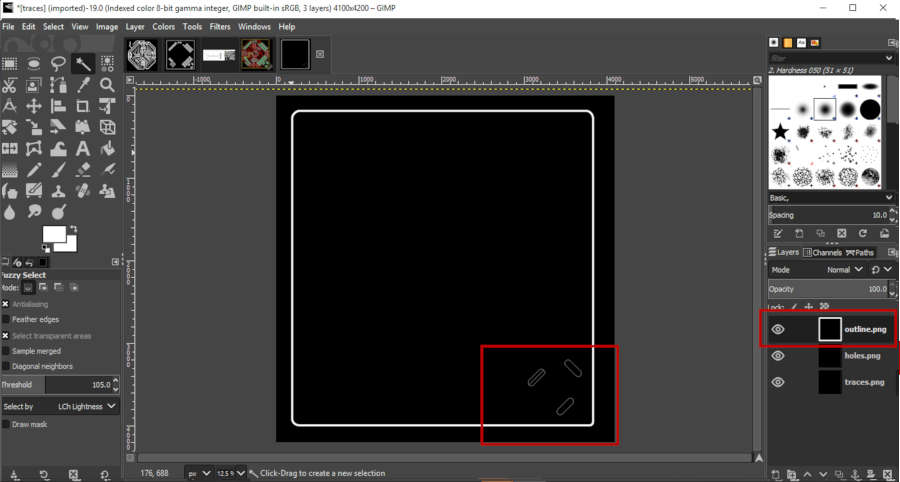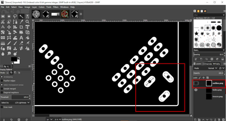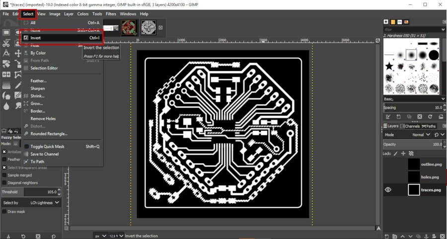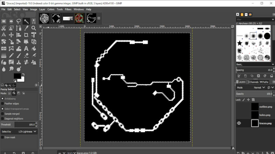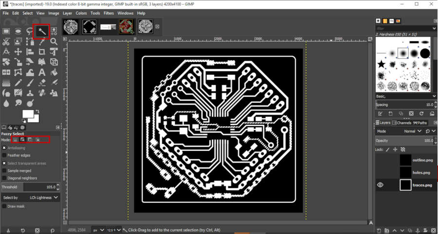 • First, I opened the traces image in GIMP. Then select the exact traces that I need to mill again, by Fuzzy tool. Make sure that I select on ‘Add selection’.