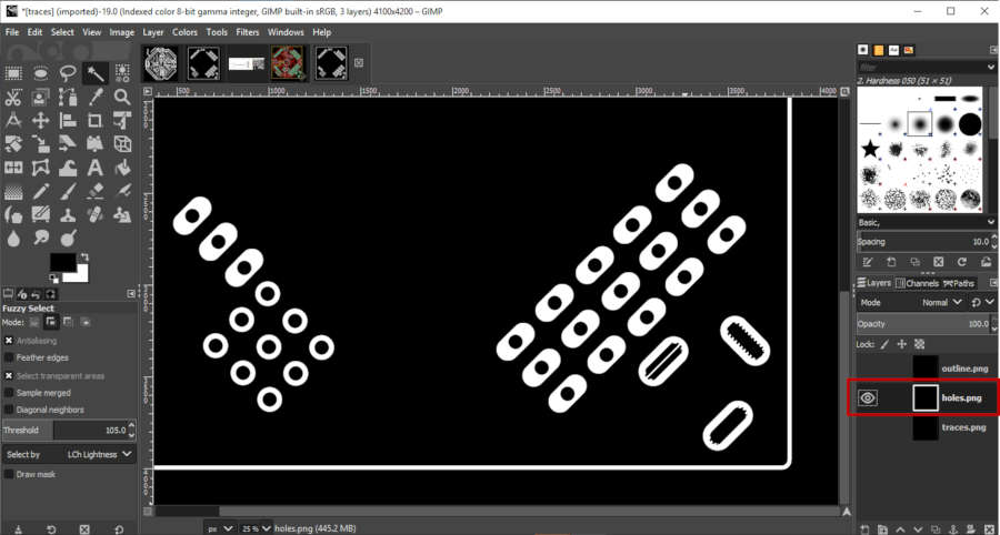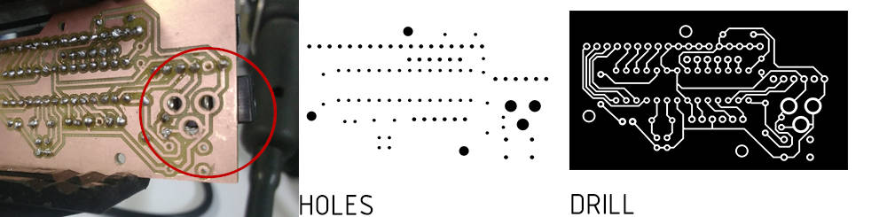• For this board, we have a new process… The holes… when we export the holes layer from Eagle, the inside holes has a Black color, the main holes is White, and the rest of the image is black… So we need to fill the background with a White color