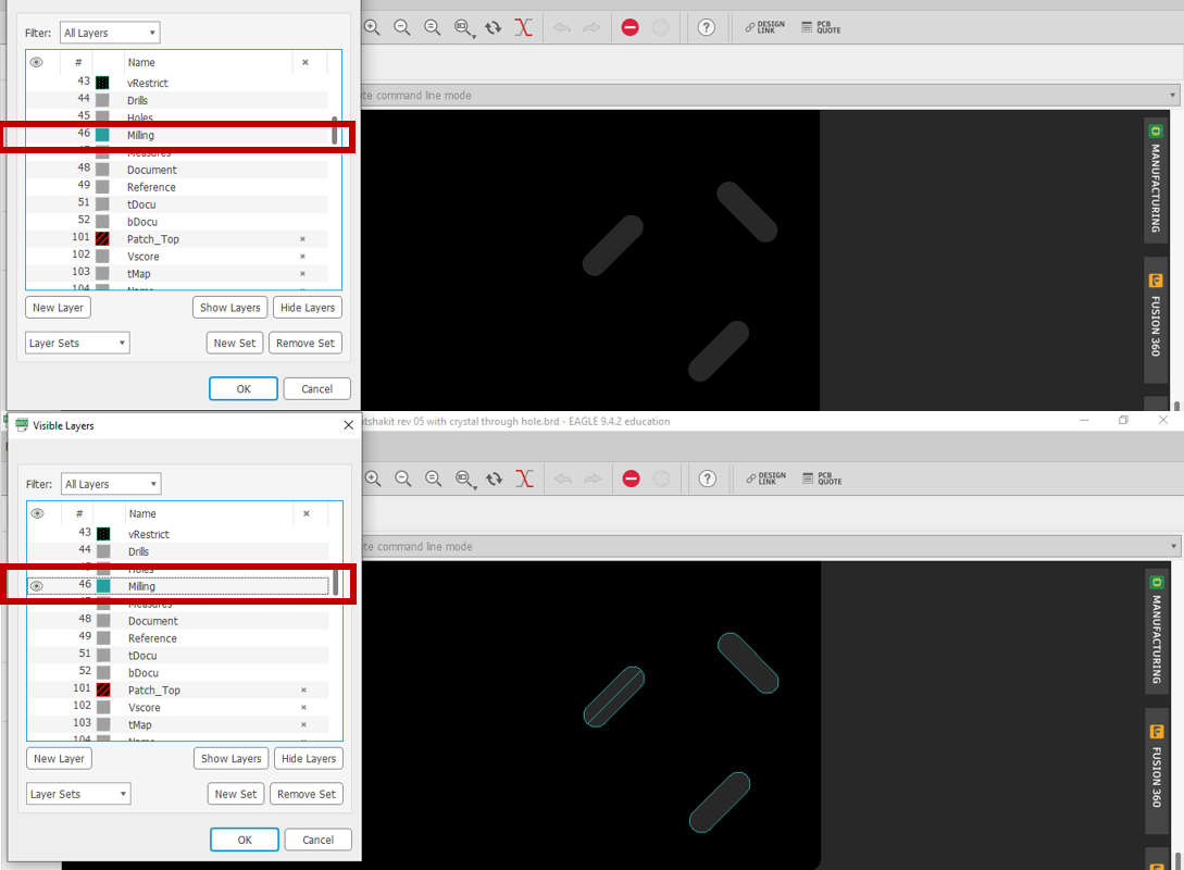 Another check… I opened the layer tab, then Hide all layers… Then opened the ‘Milling’ layer…