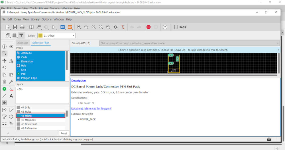 This is my experience with the through hole power jack through the Advanced Maker Diploma. I used this component that recommended from the instructor. Because this is the almost same dimension in Eagle.