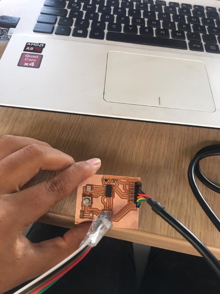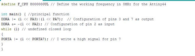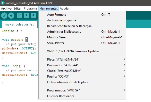 Then I did the programming, which consists of the LED light turning on every time I press the button, also For that I looked for the table of equivalences between the ATtiny 44 and the Arduino,so I can choose the right pins.