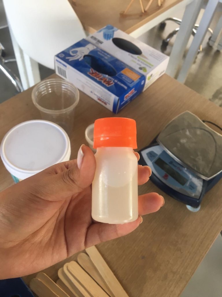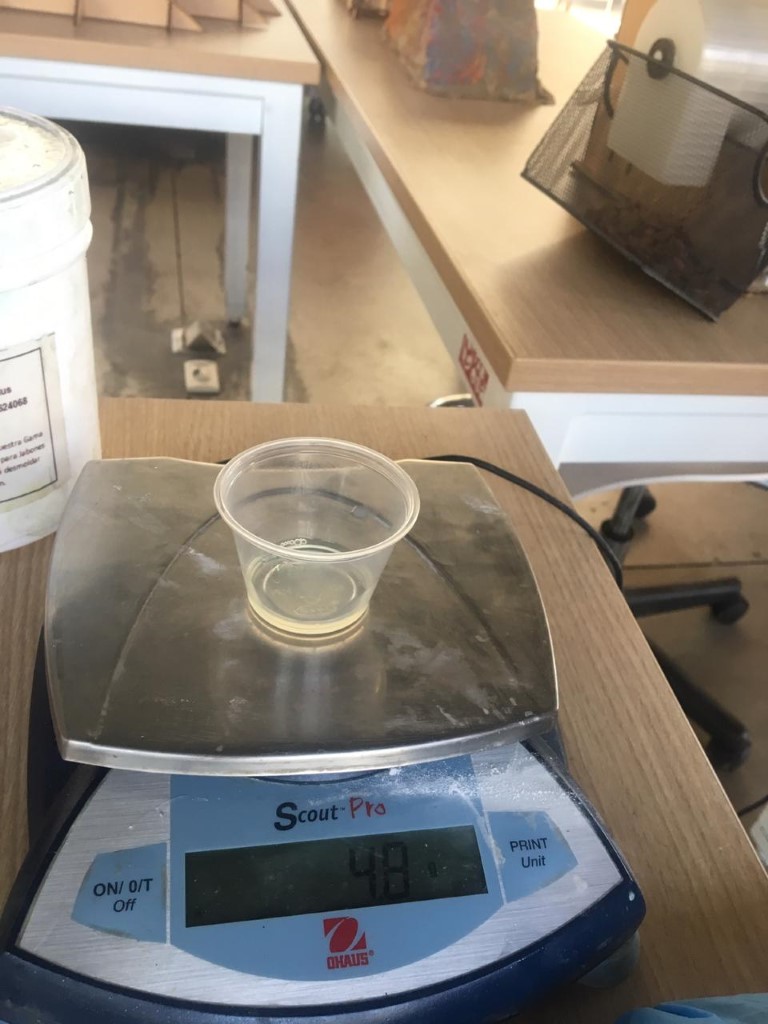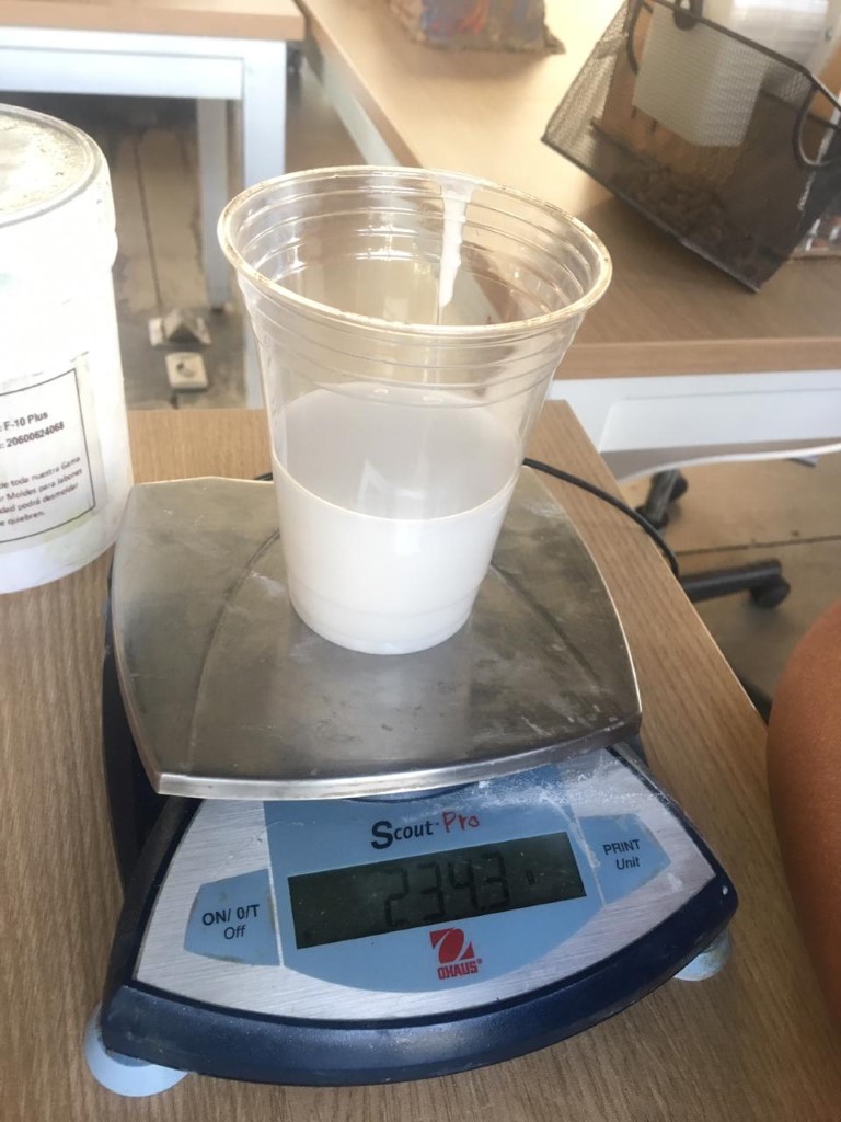 First I had to weigh the glass in which i would mix the silcone, then I weighed the amount of silicone to be table to add the 2 % of catalyst.