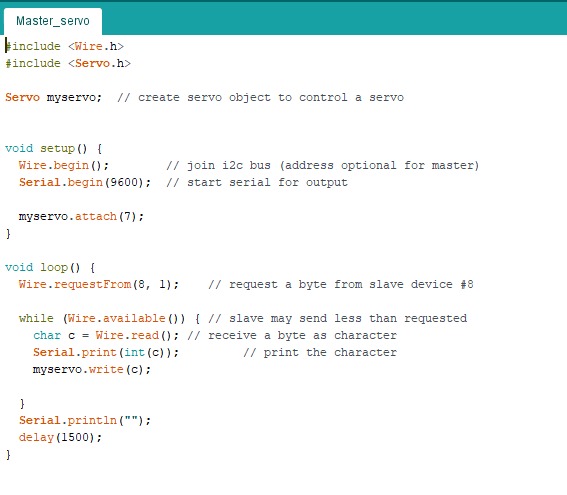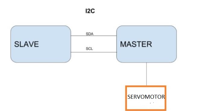 The I2C language protocol will be used in which two controllers (fabduino) The main idea is abstracted in the right image. The slave will send a numbers between 0 and 127 when the master request communication, it will get the value to transform in angle of servomotor. The slave address is 8 and send one byte. This idea become real when I connect two fabduinos through SDA/SCL pins. In master board connects a servomotor. The next images show this hardware implementation. Additionally, we connect fabduino with FTDI wire and USBasp programmer. The power supply is the same for boths kits.