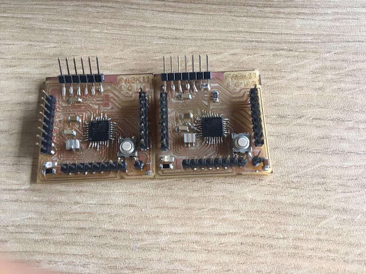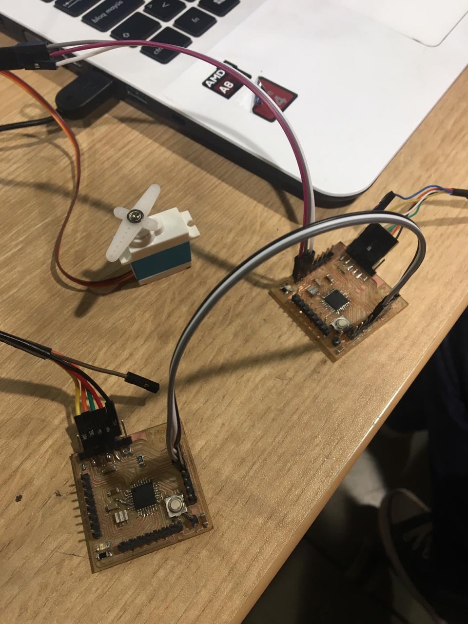 I used my Fabduino FABKIT 2.0 board and a board of the same type, to make these two connect using I2C language.