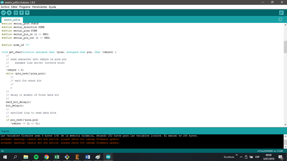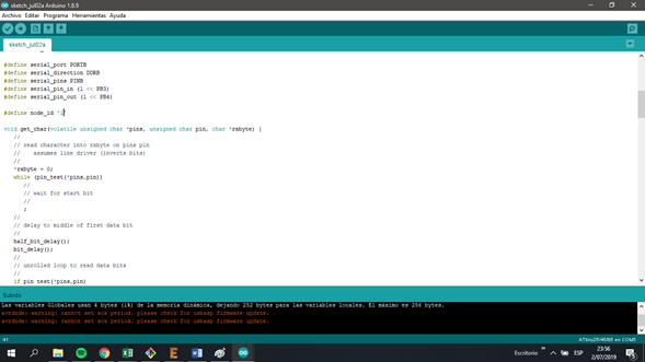 The difference between both devices is only at the add-on of the FTDI pins. Inside the hello.bus.45.c file is a code line saying “#define node_id ‘0’“. If the number is change by other variable char we can personalize each device. In my case I put 0,1 and 2.