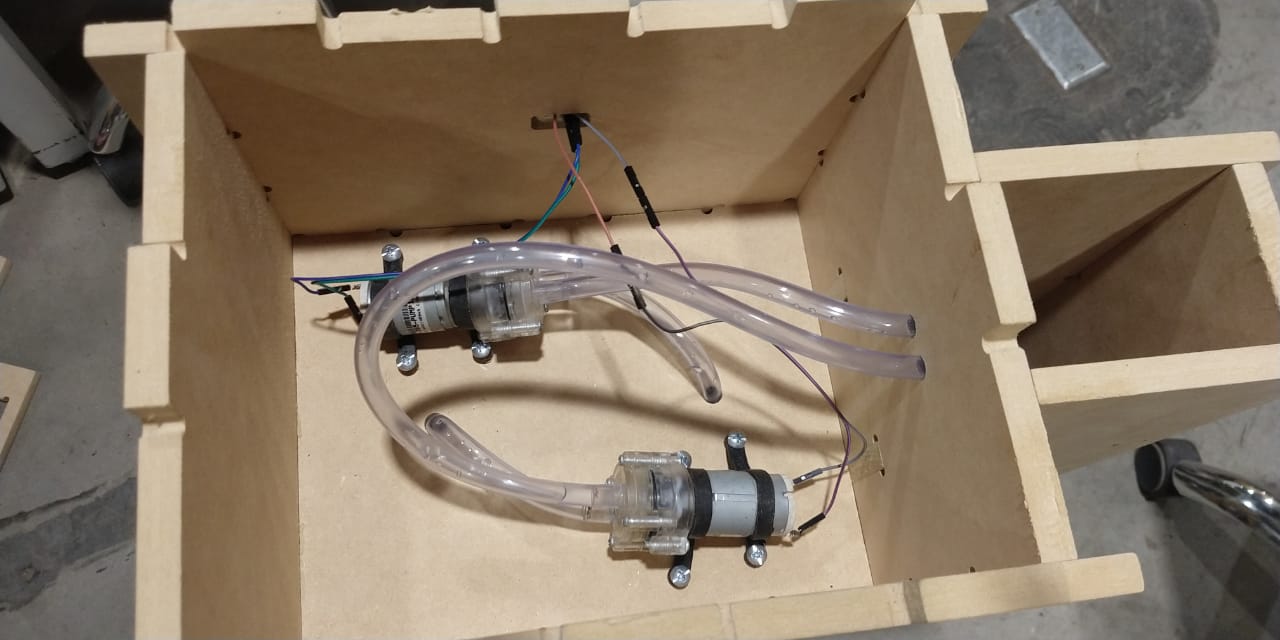 I used DC motors, which had a hydraulic valve system that allowed the liquid to be dispensed through two hose,