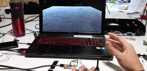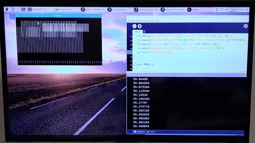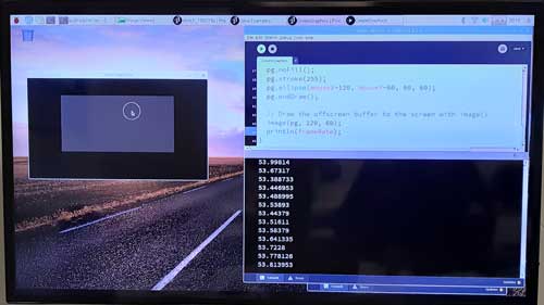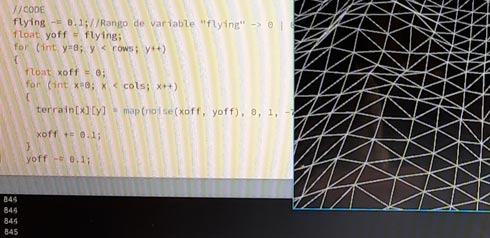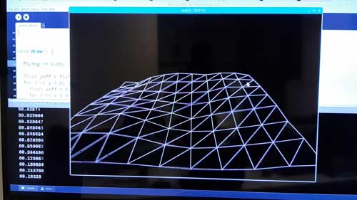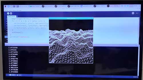 To apply more stress on the Raspberry and try to drop the frameRates, we resorted to Daniel Shiffman's Coding train tutorials. There we found this video and this code to generate a random terrain using the renderer P3D. After running this example, the frame rate dropped to 2 fps, meaning that it was difficult for the Rasberry to run this sketch fluently. By changing a little bit the code and reducing the number of vertices, we managed to raise the frames back to 60 fps, with the visual difference of the simplicity of the terrain.